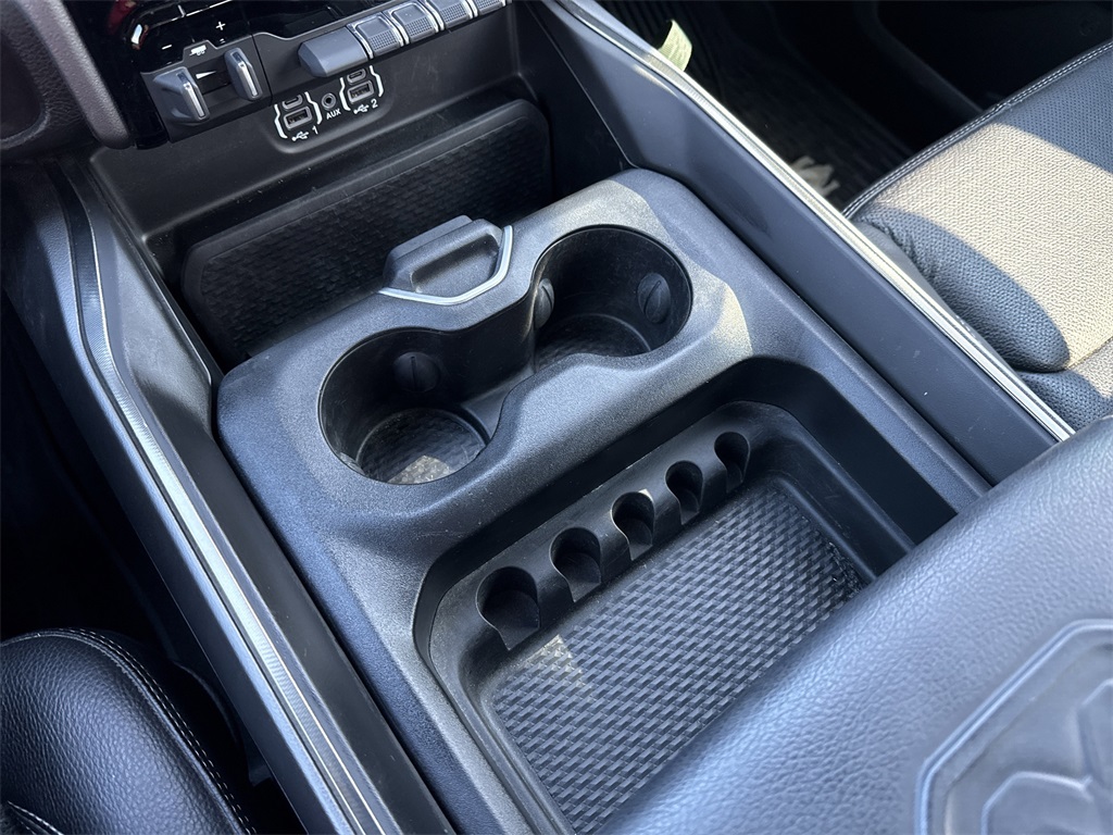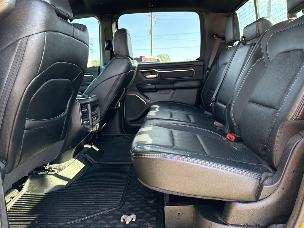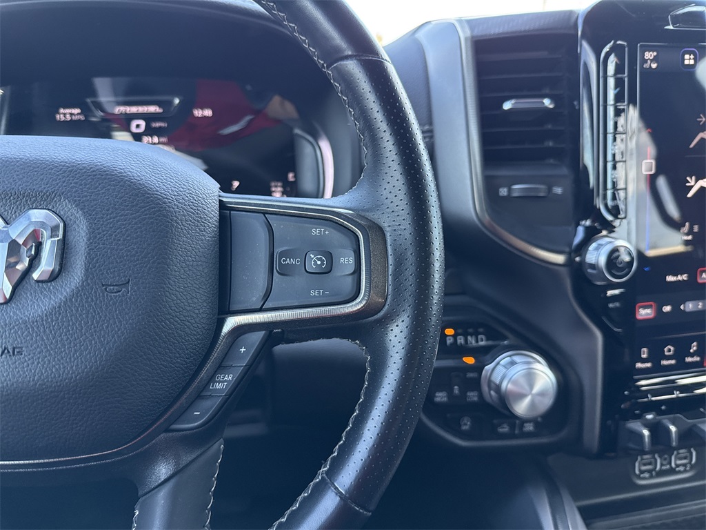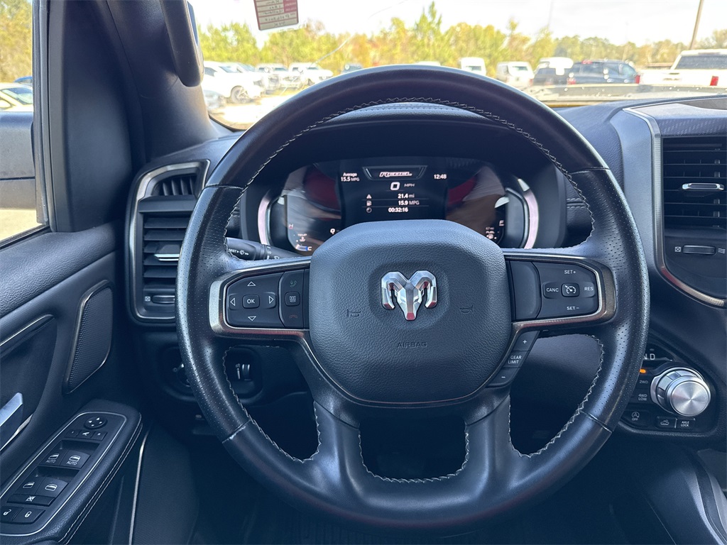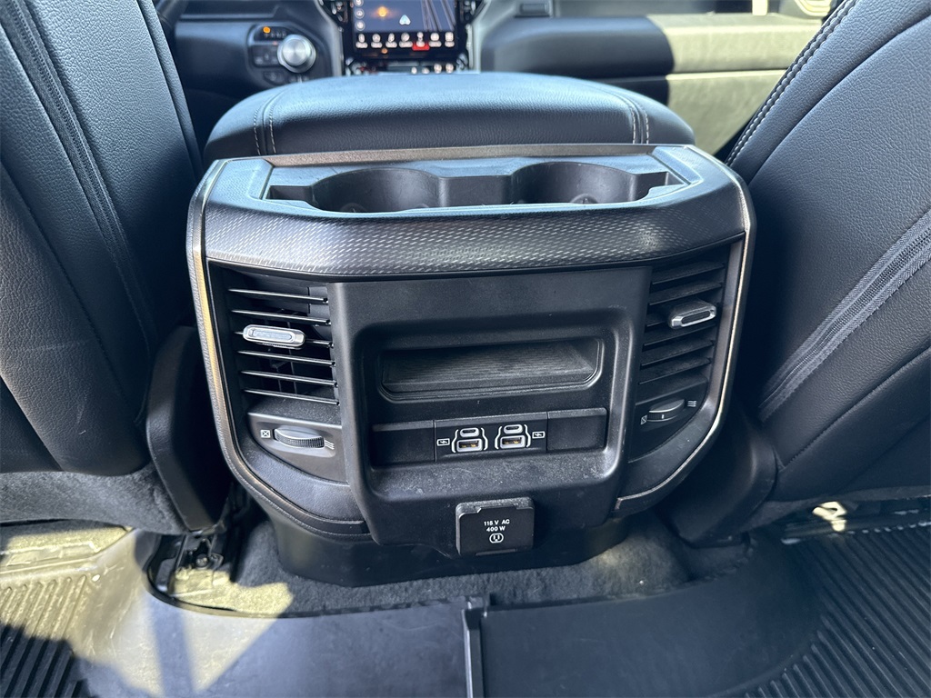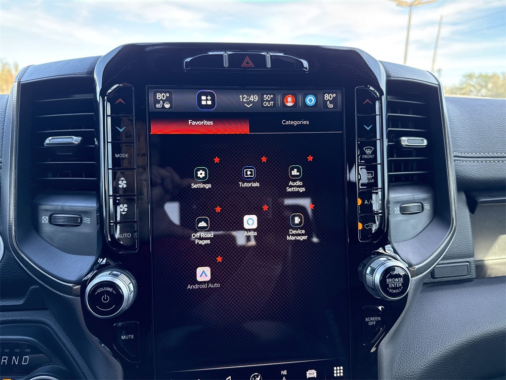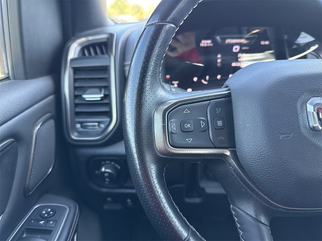 oor Console, Grille Surround 2 Black Texture 3 Black, Heated Front Seats, Heated Steering Wheel, Lux Leather Trimmed Bucket Seats, MOPAR Rebel Exterior Side Graphics, MOPAR Rebel Hood Decal, Power 2-Way Driver Lumbar Adjust, Power 2-Way Passenger Lumbar Adjust, Power 8-Way Driver & Passenger Seats, RAM Grille Badge - Black, Rear 60/40 Folding Seat, and Wheels: 18" x 8.0" Gloss Black), Rebel Level 2 Equipment Group (115V Auxiliary Rear Power Outlet, 12" Touchscreen Display, 2-Door Passive Entry, Front Door Locks, 2nd Row In Floor Storage Bins, 4G LTE Wi-Fi Hot Spot, Accent Color Door Handles, Apple CarPlay, Auto-Dimming Exterior Driver Mirror, Black Exterior Mirrors, Black Premium Power Mirrors, Connected Travel & Traffic Services, Connectivity - US/Canada, Convex Wide-Angle Exterior Mirror Insert, Disassociated Touchscreen Display, Exterior Mirrors Courtesy Lamps, Exterior Mirrors w/Heating Element, Exterior Mirrors w/Supplemental Signals, Foam Bottle Insert (Door Trim Panel), For Details, Visit DriveUconnect.com, For More Info, Call 800-643-2112, Global Telematics Box Module (TBM), Google Android Auto, GPS Antenna Input, GPS Navigation, harman/kardon 19 Speaker Premium Sound, HD Radio, Integrated Center Stack Radio, Integrated Voice Command w/Bluetooth, Media Hub w/2 Charge Only USBs, Off-Road Information Pages, ParkSense Front/Rear Park Assist w/Stop, Power 8-Way Driver Seat, Power Adjustable Pedals, Power-Folding Mirrors, Radio: Uconnect 5 Nav w/12.0" Display, Rain Sensitive Windshield Wipers, Rear Dome w/On/Off Switch Lamp, Rear Power Sliding Window, Rear Underseat Compartment Storage, Rear Window Defroster, Remote Start System, Security Alarm, SiriusXM Radio Service, SiriusXM w/360L, Sun Visors w/Illuminated Vanity Mirrors, Universal Garage Door Opener, and USB Host Flip), 3.92 Rear Axle Ratio, 4-Wheel Disc Brakes, 48V Belt Starter Generator, 6 Speakers, ABS brakes, Air Conditioning, Alloy wheels, AM/FM radio: SiriusXM with 360L, Apple CarPlay/Android Auto, Auto-dimming Rear-View mirror, Automatic temperature control, Blind Spot & Cross Path Detection, Brake assist, Class IV Receiver Hitch, Cloth/Vinyl Low Back Bucket Seats, Compass, Delay-off headlights, Driver door bin, Dual front impact airbags, Dual front side impact airbags, Electronic Stability Control, Emergency communication system: SiriusXM Guardian, Front anti-roll bar, Front Bucket Seats, Front Center Armrest w/Storage, Front dual zone A/C, Front fog lights, Front License Plate Bracket, Front reading lights, Front wheel independent suspension, Fully automatic headlights, Heated door mirrors, Illuminated entry, Instrument Cluster Theme 5 - Rebel 2, Leather steering wheel, Low tire pressure warning, MOPAR Spray In Bedliner, Navigation System, Occupant sensing airbag, Outside temperature display, Overhead airbag, Overhead console, Panic alarm, ParkView Rear Back-Up Camera, Passenger door bin, Passenger vanity mirror, Power door mirrors, Power steering, Power windows, Radio data system, Radio: Uconnect 5 Nav w/8.4" Display, Rear anti-roll bar, Rear seat center armrest, Rear step bumper, Remote keyless entry, Speed control, Split folding rear seat, Steering wheel mounted audio controls, Tachometer, Telescoping steering wheel, Tilt steering wheel, Traction control, Trailer Brake Control, Trip computer, Variably intermittent wipers, Voltmeter, and Wheels: 18" x 8.0" Painted Mid-Gloss BlacK.