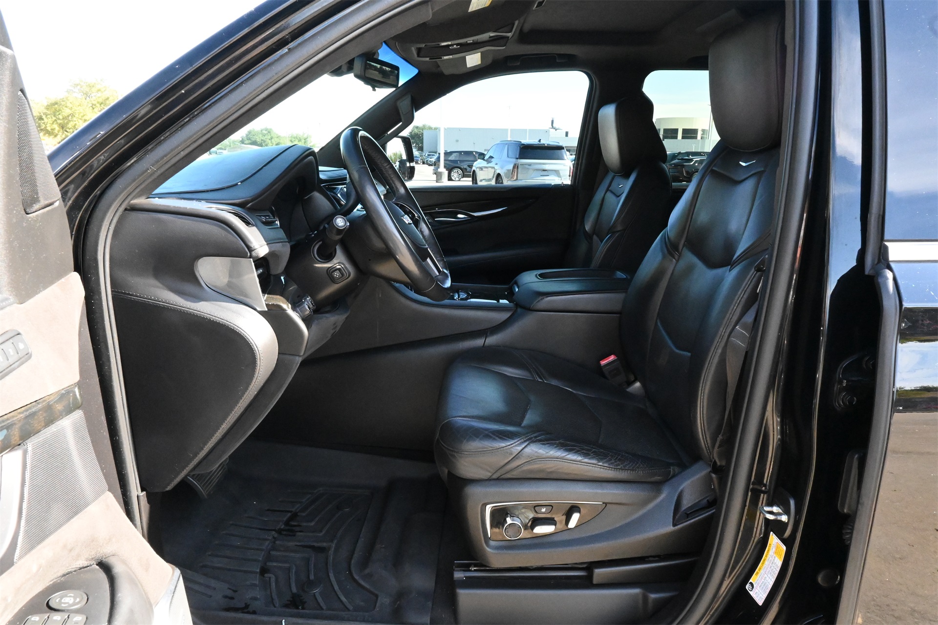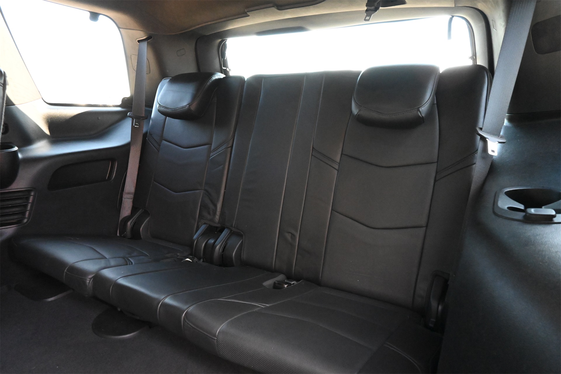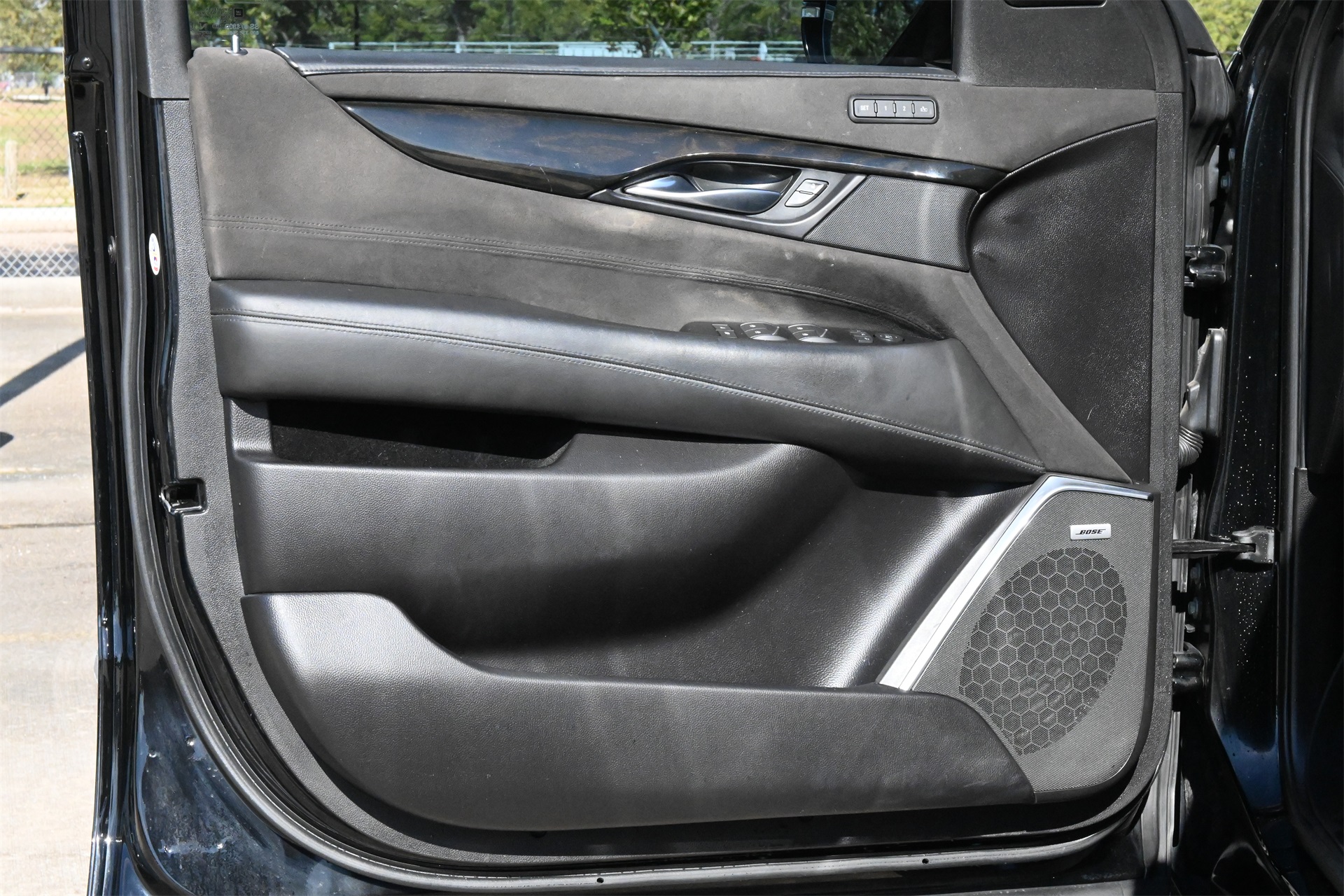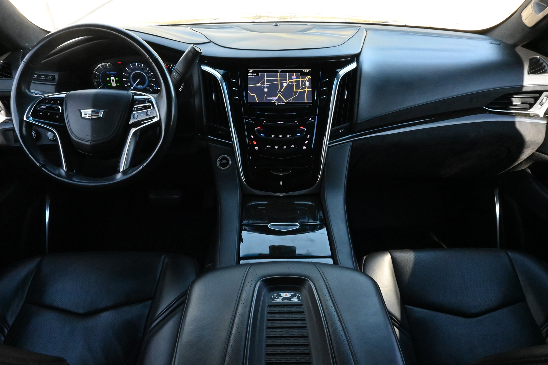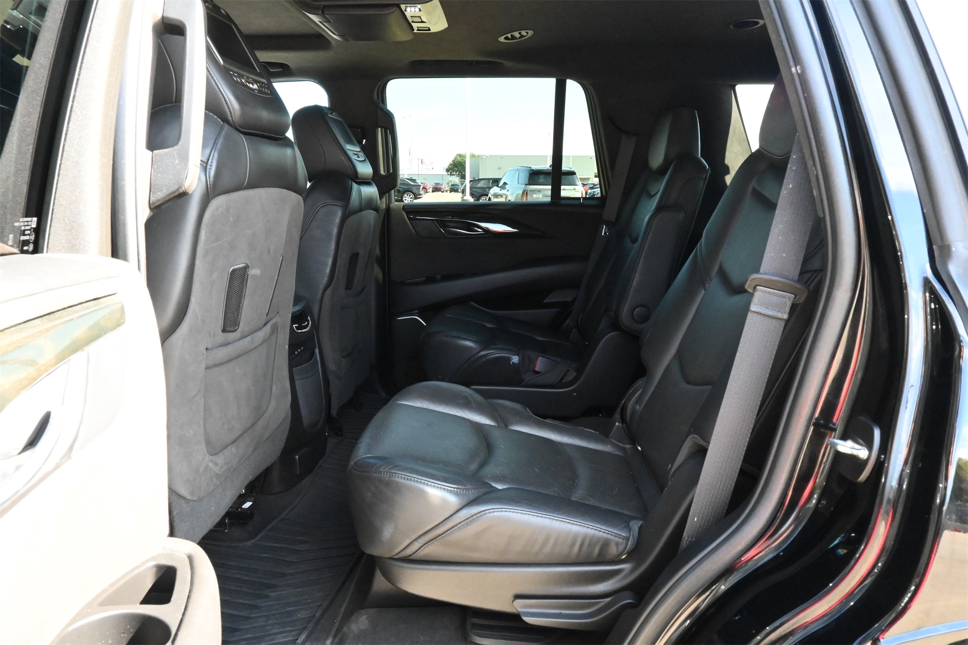 ), Preferred Equipment Group 1SD (Forward Collision Alert, Illuminated Door Handles, IntelliBeam Automatic High Beam On/Off, Lane Change Alert w/Side Blind Zone Alert, Lane Keep Assist w/Lane Departure Warning, Power Tilt-Sliding Sunroof w/Express-Open/Close, Power-Retractable Assist Steps, Rear Camera Mirror, Rear Camera Washer, Rear Cross-Traffic Alert, Rear Seat Entertainment System, Reconfigurable 4-Color Head-Up Display, Safety Alert Seat, Second Row Bucket Seats, and VAC Power 17" Disc Brakes), Theft-Deterrent Package (Inclination Sensor, Theft-Deterrent Alarm System, and Vehicle Interior Movement Sensor), 4WD, Jet Black With Jet Black Accents Leather, 16 Speakers, 1st 2nd & 3rd Row All-Weather Floor Mats (LPO), 2-Position Memory For Driver's Seat Adjuster, 3.23 Axle Ratio, 3rd row seats: split-bench, 4-Wheel Disc Brakes, A/V remote, ABS brakes, Adaptive suspension, Adjustable pedals, Air Conditioning, Alloy wheels, AM/FM radio: SiriusXM, Apple CarPlay/Android Auto, Auto High-beam Headlights, Auto tilt-away steering wheel, Auto-dimming door mirrors, Auto-leveling suspension, Automatic temperature control, Black Front License Plate Bracket, Bodyside moldings, Bose Centerpoint 16 Speaker Surround Sound System, Brake assist, Bumpers: body-color, CD player, Chrome Exhaust Tip, Compass, Delay-off headlights, Driver door bin, Driver vanity mirror, Dual front impact airbags, Dual front side impact airbags, DVD-Audio, Electronic Stability Control, Emergency communication system: OnStar and Cadillac connected services capable, Exterior Parking Camera Rear, Front anti-roll bar, Front Bucket Seats, Front Center Armrest w/Storage, Front dual zone A/C, Front reading lights, Front wheel independent suspension, Fully automatic headlights, Garage door transmitter, Genuine wood dashboard insert, HD Radio, Headphones, Heads-Up Display, Heated & Cooled Front Bucket Seats, Heated door mirrors, Heated front seats, Heated rear seats, Heated steering wheel, Illuminated entry, Leather Shift Knob, Leather steering wheel, Low tire pressure warning, Magnetic Ride Control Suspension, Memory seat, Navigation System, NavTraffic, Occupant sensing airbag, Outside temperature display, Overhead airbag, Overhead console, Panic alarm, Passenger door bin, Passenger vanity mirror, Pedal memory, Power door mirrors, Power driver seat, Power Liftgate, Power moonroof, Power passenger seat, Power steering, Power windows, Radio data system, Radio: AM/FM Cadillac User Experience w/Nav, Rain sensing wipers, Rear air conditioning, Rear anti-roll bar, Rear audio controls, Rear reading lights, Rear window defroster, Rear window wiper, Remote keyless entry, Roof rack: rails only, Security system, Semi-Aniline Leather Seating Surfaces, SiriusXM Satellite Radio, Speed control, Split folding rear seat, Spoiler, Steering wheel memory, Steering wheel mounted audio controls, Tachometer, Telescoping steering wheel, Tilt steering wheel, Traction control, Trip computer, Turn signal indicator mirrors, Variably intermittent wipers, Ventilated front seats, and Wheels: 22" x 9" Premium Painted w/Chrome Inserts. Black Raven 4WD 10-Speed Automatic with Overdrive 6.2L Variable Valve Timing V8 SIDI CARFAX 1-Owner, Clean CARFAX!, Non-Smoker, Local Trade, Low Miles, Bluetooth, Apple Carplay / Android Auto, Heated Seats, Cooled Seats, 4WD, Jet Black With Jet Black Accents Leather.