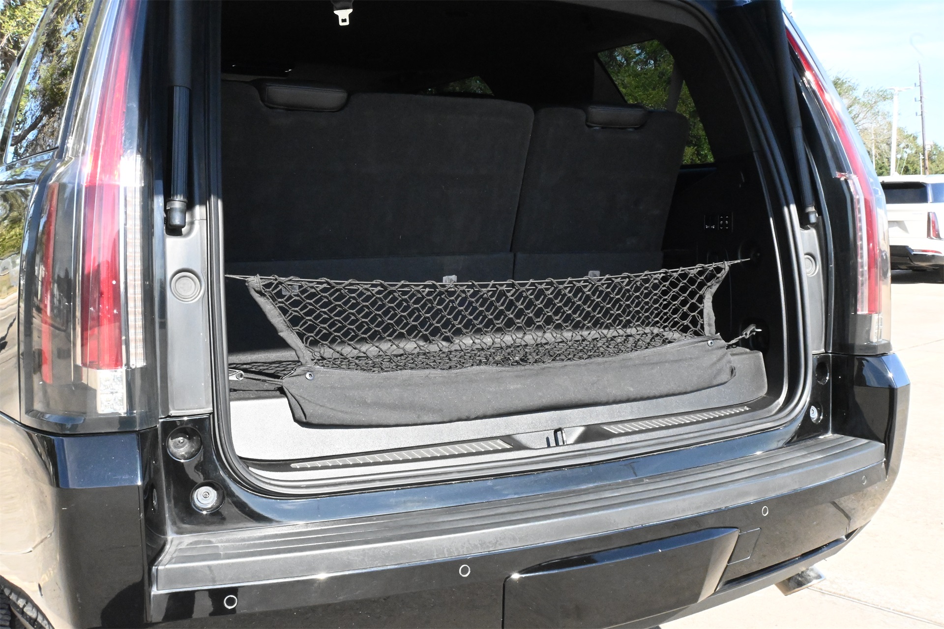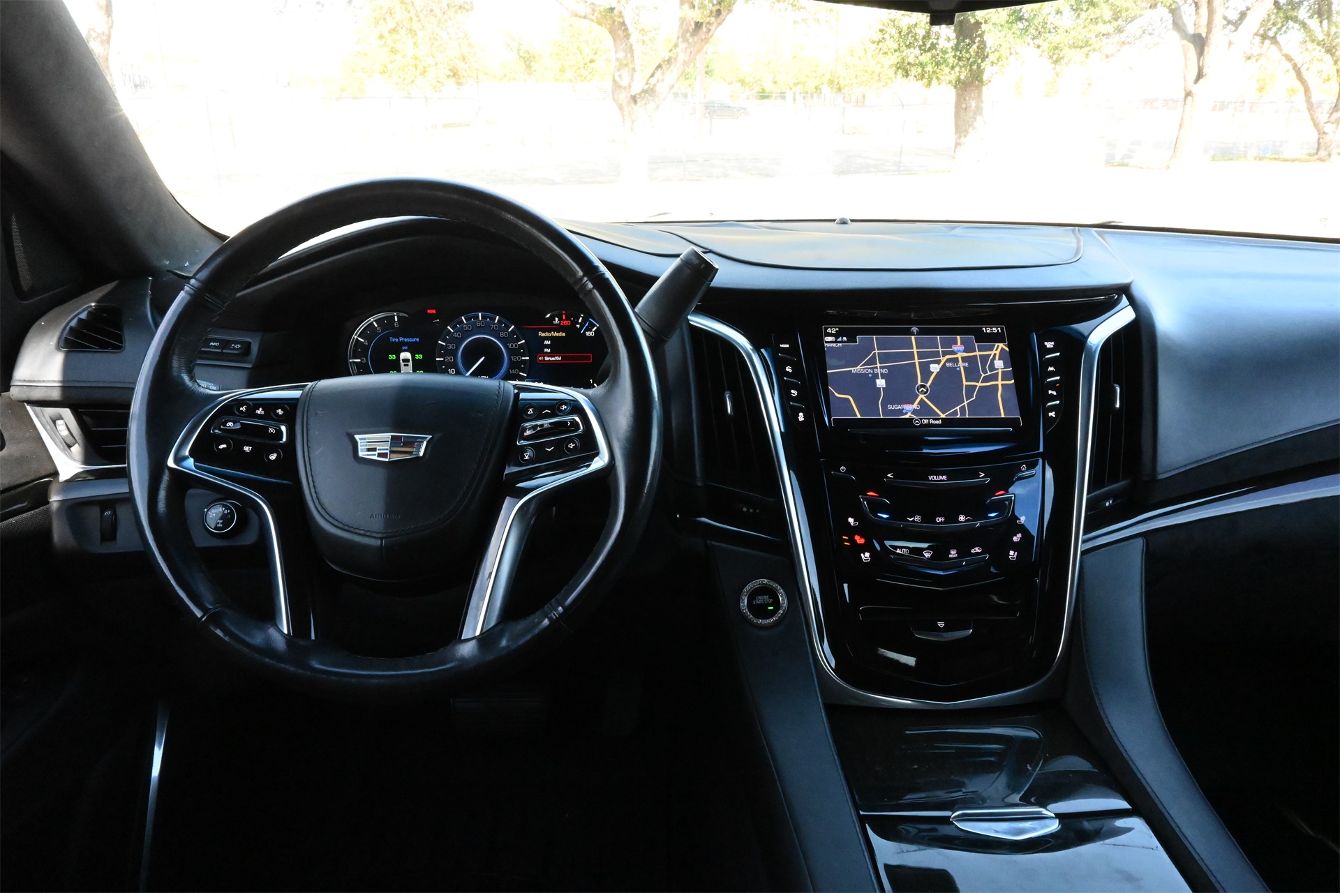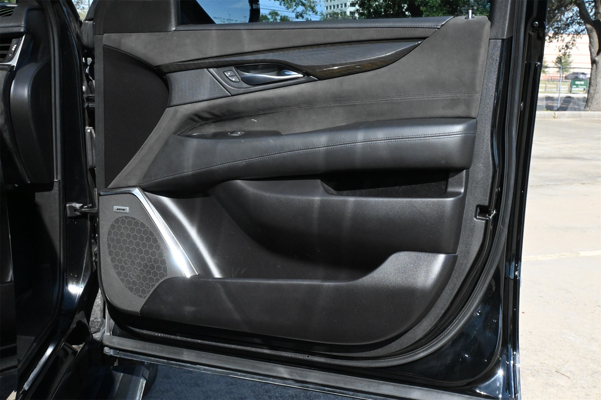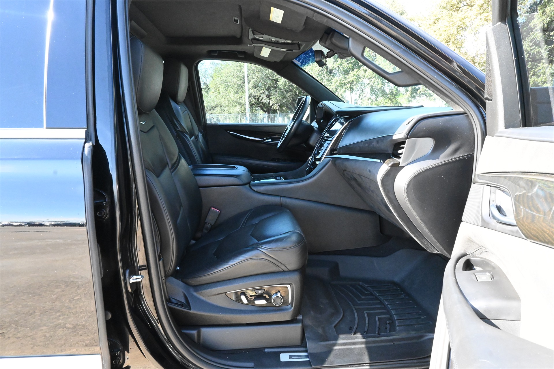 ), Preferred Equipment Group 1SD (Forward Collision Alert, Illuminated Door Handles, IntelliBeam Automatic High Beam On/Off, Lane Change Alert w/Side Blind Zone Alert, Lane Keep Assist w/Lane Departure Warning, Power Tilt-Sliding Sunroof w/Express-Open/Close, Power-Retractable Assist Steps, Rear Camera Mirror, Rear Camera Washer, Rear Cross-Traffic Alert, Rear Seat Entertainment System, Reconfigurable 4-Color Head-Up Display, Safety Alert Seat, Second Row Bucket Seats, and VAC Power 17" Disc Brakes), Theft-Deterrent Package (Inclination Sensor, Theft-Deterrent Alarm System, and Vehicle Interior Movement Sensor), 4WD, Jet Black With Jet Black Accents Leather, 16 Speakers, 1st 2nd & 3rd Row All-Weather Floor Mats (LPO), 2-Position Memory For Driver's Seat Adjuster, 3.23 Axle Ratio, 3rd row seats: split-bench, 4-Wheel Disc Brakes, A/V remote, ABS brakes, Adaptive suspension, Adjustable pedals, Air Conditioning, Alloy wheels, AM/FM radio: SiriusXM, Apple CarPlay/Android Auto, Auto High-beam Headlights, Auto tilt-away steering wheel, Auto-dimming door mirrors, Auto-leveling suspension, Automatic temperature control, Black Front License Plate Bracket, Bodyside moldings, Bose Centerpoint 16 Speaker Surround Sound System, Brake assist, Bumpers: body-color, CD player, Chrome Exhaust Tip, Compass, Delay-off headlights, Driver door bin, Driver vanity mirror, Dual front impact airbags, Dual front side impact airbags, DVD-Audio, Electronic Stability Control, Emergency communication system: OnStar and Cadillac connected services capable, Exterior Parking Camera Rear, Front anti-roll bar, Front Bucket Seats, Front Center Armrest w/Storage, Front dual zone A/C, Front reading lights, Front wheel independent suspension, Fully automatic headlights, Garage door transmitter, Genuine wood dashboard insert, HD Radio, Headphones, Heads-Up Display, Heated & Cooled Front Bucket Seats, Heated door mirrors, Heated front seats, Heated rear seats, Heated steering wheel, Illuminated entry, Leather Shift Knob, Leather steering wheel, Low tire pressure warning, Magnetic Ride Control Suspension, Memory seat, Navigation System, NavTraffic, Occupant sensing airbag, Outside temperature display, Overhead airbag, Overhead console, Panic alarm, Passenger door bin, Passenger vanity mirror, Pedal memory, Power door mirrors, Power driver seat, Power Liftgate, Power moonroof, Power passenger seat, Power steering, Power windows, Radio data system, Radio: AM/FM Cadillac User Experience w/Nav, Rain sensing wipers, Rear air conditioning, Rear anti-roll bar, Rear audio controls, Rear reading lights, Rear window defroster, Rear window wiper, Remote keyless entry, Roof rack: rails only, Security system, Semi-Aniline Leather Seating Surfaces, SiriusXM Satellite Radio, Speed control, Split folding rear seat, Spoiler, Steering wheel memory, Steering wheel mounted audio controls, Tachometer, Telescoping steering wheel, Tilt steering wheel, Traction control, Trip computer, Turn signal indicator mirrors, Variably intermittent wipers, Ventilated front seats, and Wheels: 22" x 9" Premium Painted w/Chrome Inserts. Black Raven 4WD 10-Speed Automatic with Overdrive 6.2L Variable Valve Timing V8 SIDI CARFAX 1-Owner, Clean CARFAX!, Non-Smoker, Local Trade, Low Miles, Bluetooth, Apple Carplay / Android Auto, Heated Seats, Cooled Seats, 4WD, Jet Black With Jet Black Accents Leather.