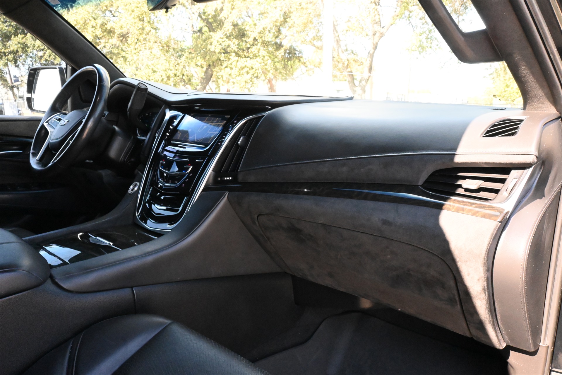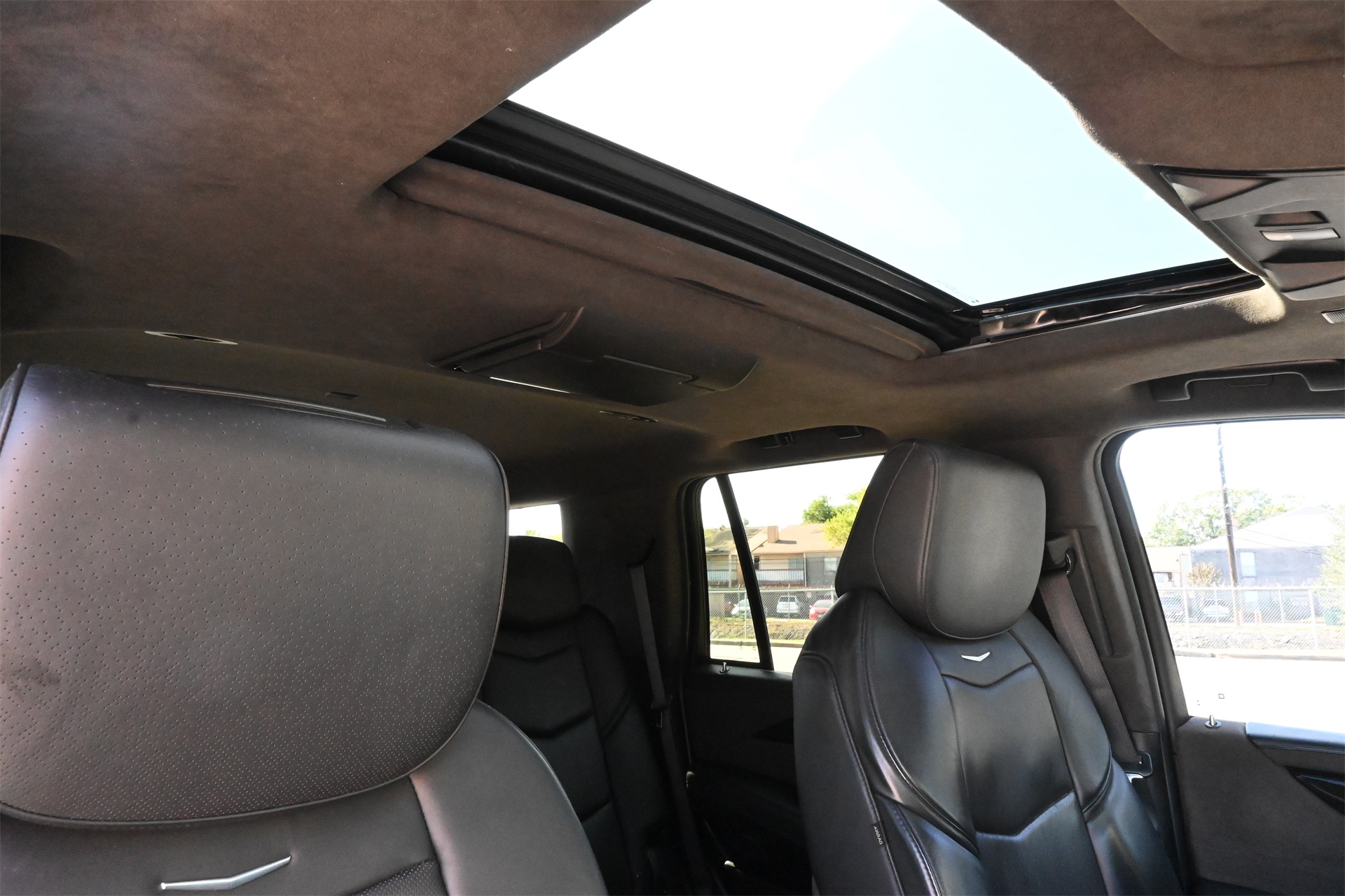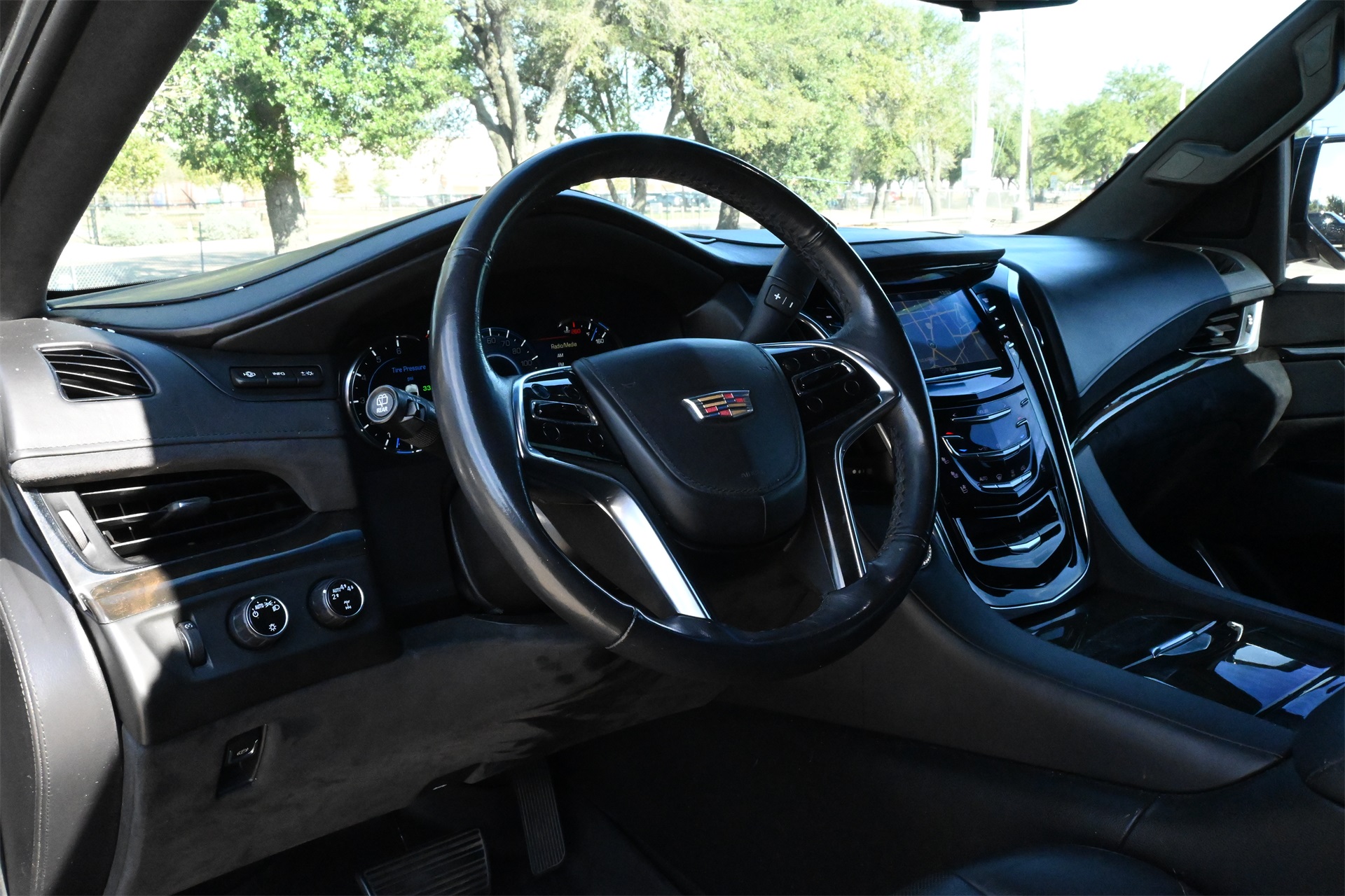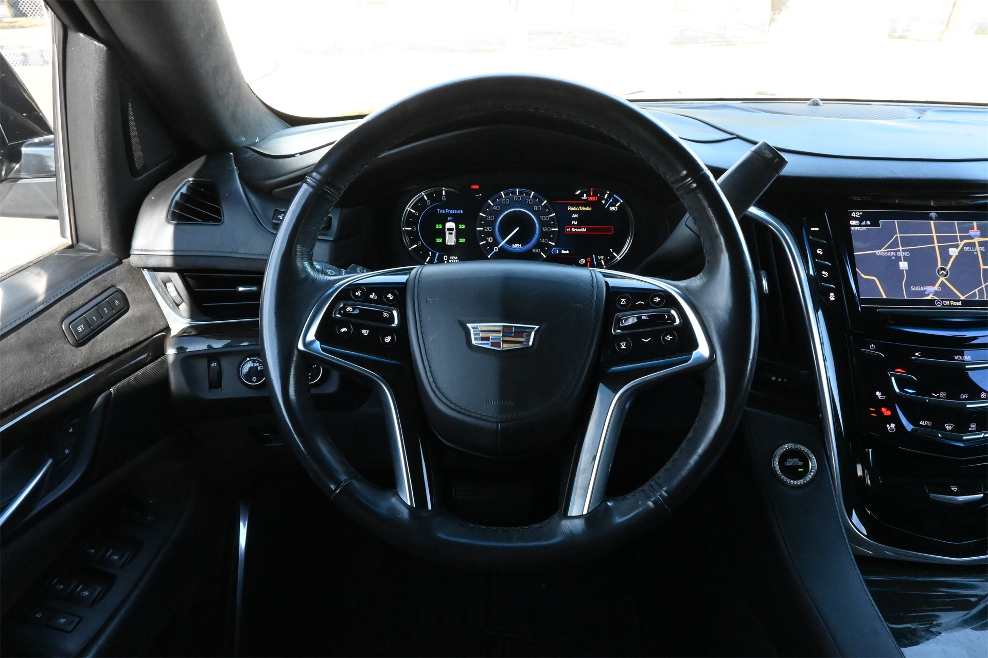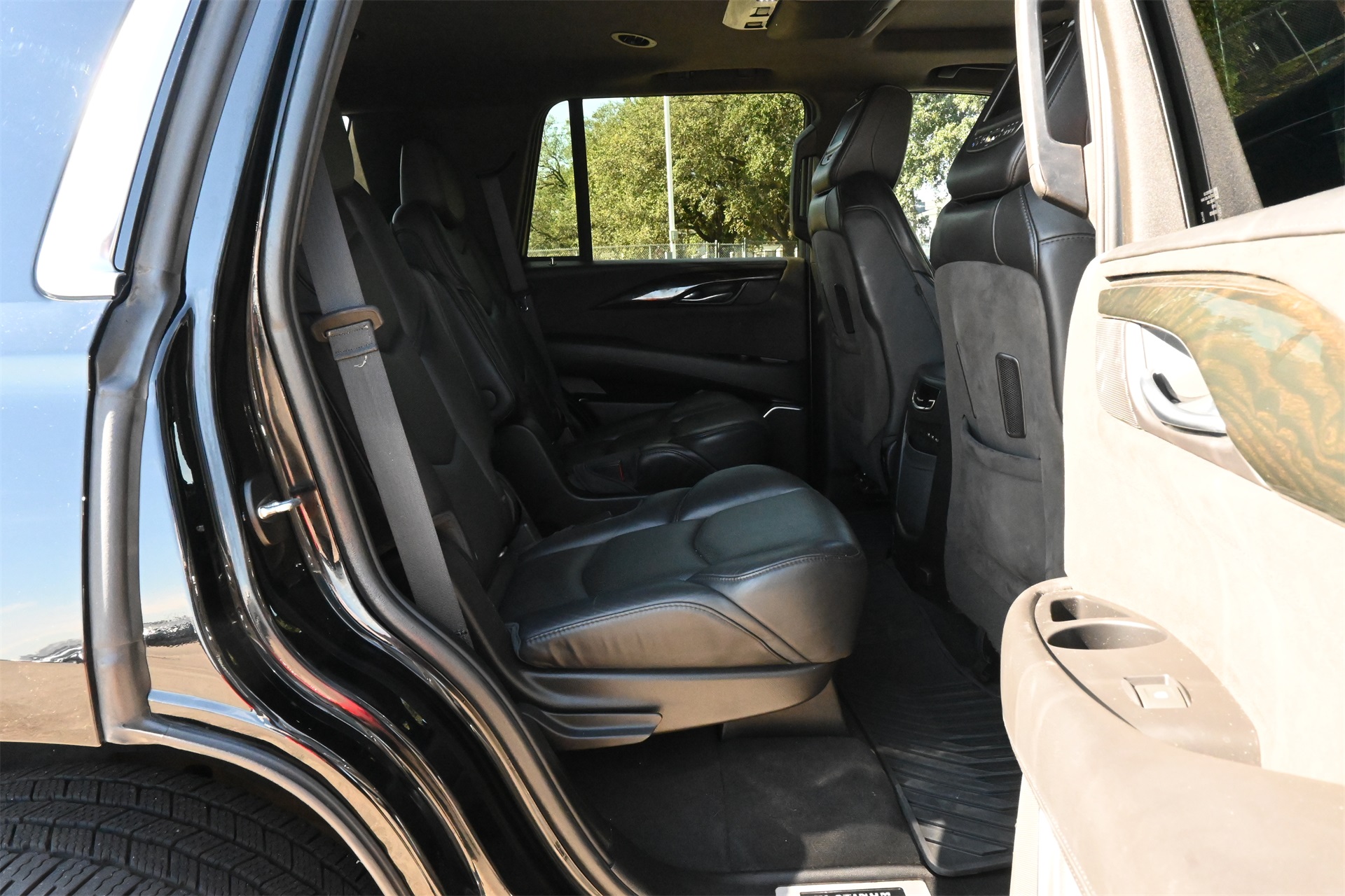 ), Preferred Equipment Group 1SD (Forward Collision Alert, Illuminated Door Handles, IntelliBeam Automatic High Beam On/Off, Lane Change Alert w/Side Blind Zone Alert, Lane Keep Assist w/Lane Departure Warning, Power Tilt-Sliding Sunroof w/Express-Open/Close, Power-Retractable Assist Steps, Rear Camera Mirror, Rear Camera Washer, Rear Cross-Traffic Alert, Rear Seat Entertainment System, Reconfigurable 4-Color Head-Up Display, Safety Alert Seat, Second Row Bucket Seats, and VAC Power 17" Disc Brakes), Theft-Deterrent Package (Inclination Sensor, Theft-Deterrent Alarm System, and Vehicle Interior Movement Sensor), 4WD, Jet Black With Jet Black Accents Leather, 16 Speakers, 1st 2nd & 3rd Row All-Weather Floor Mats (LPO), 2-Position Memory For Driver's Seat Adjuster, 3.23 Axle Ratio, 3rd row seats: split-bench, 4-Wheel Disc Brakes, A/V remote, ABS brakes, Adaptive suspension, Adjustable pedals, Air Conditioning, Alloy wheels, AM/FM radio: SiriusXM, Apple CarPlay/Android Auto, Auto High-beam Headlights, Auto tilt-away steering wheel, Auto-dimming door mirrors, Auto-leveling suspension, Automatic temperature control, Black Front License Plate Bracket, Bodyside moldings, Bose Centerpoint 16 Speaker Surround Sound System, Brake assist, Bumpers: body-color, CD player, Chrome Exhaust Tip, Compass, Delay-off headlights, Driver door bin, Driver vanity mirror, Dual front impact airbags, Dual front side impact airbags, DVD-Audio, Electronic Stability Control, Emergency communication system: OnStar and Cadillac connected services capable, Exterior Parking Camera Rear, Front anti-roll bar, Front Bucket Seats, Front Center Armrest w/Storage, Front dual zone A/C, Front reading lights, Front wheel independent suspension, Fully automatic headlights, Garage door transmitter, Genuine wood dashboard insert, HD Radio, Headphones, Heads-Up Display, Heated & Cooled Front Bucket Seats, Heated door mirrors, Heated front seats, Heated rear seats, Heated steering wheel, Illuminated entry, Leather Shift Knob, Leather steering wheel, Low tire pressure warning, Magnetic Ride Control Suspension, Memory seat, Navigation System, NavTraffic, Occupant sensing airbag, Outside temperature display, Overhead airbag, Overhead console, Panic alarm, Passenger door bin, Passenger vanity mirror, Pedal memory, Power door mirrors, Power driver seat, Power Liftgate, Power moonroof, Power passenger seat, Power steering, Power windows, Radio data system, Radio: AM/FM Cadillac User Experience w/Nav, Rain sensing wipers, Rear air conditioning, Rear anti-roll bar, Rear audio controls, Rear reading lights, Rear window defroster, Rear window wiper, Remote keyless entry, Roof rack: rails only, Security system, Semi-Aniline Leather Seating Surfaces, SiriusXM Satellite Radio, Speed control, Split folding rear seat, Spoiler, Steering wheel memory, Steering wheel mounted audio controls, Tachometer, Telescoping steering wheel, Tilt steering wheel, Traction control, Trip computer, Turn signal indicator mirrors, Variably intermittent wipers, Ventilated front seats, and Wheels: 22" x 9" Premium Painted w/Chrome Inserts. Black Raven 4WD 10-Speed Automatic with Overdrive 6.2L Variable Valve Timing V8 SIDI CARFAX 1-Owner, Clean CARFAX!, Non-Smoker, Local Trade, Low Miles, Bluetooth, Apple Carplay / Android Auto, Heated Seats, Cooled Seats, 4WD, Jet Black With Jet Black Accents Leather.