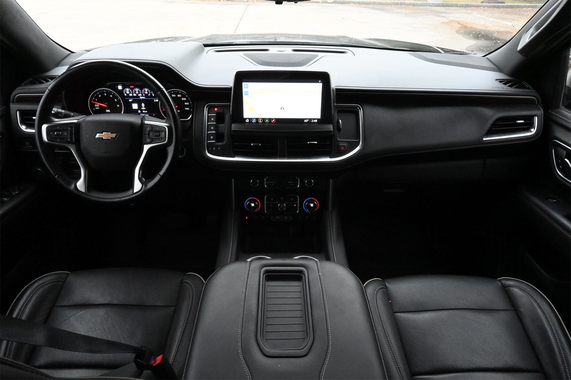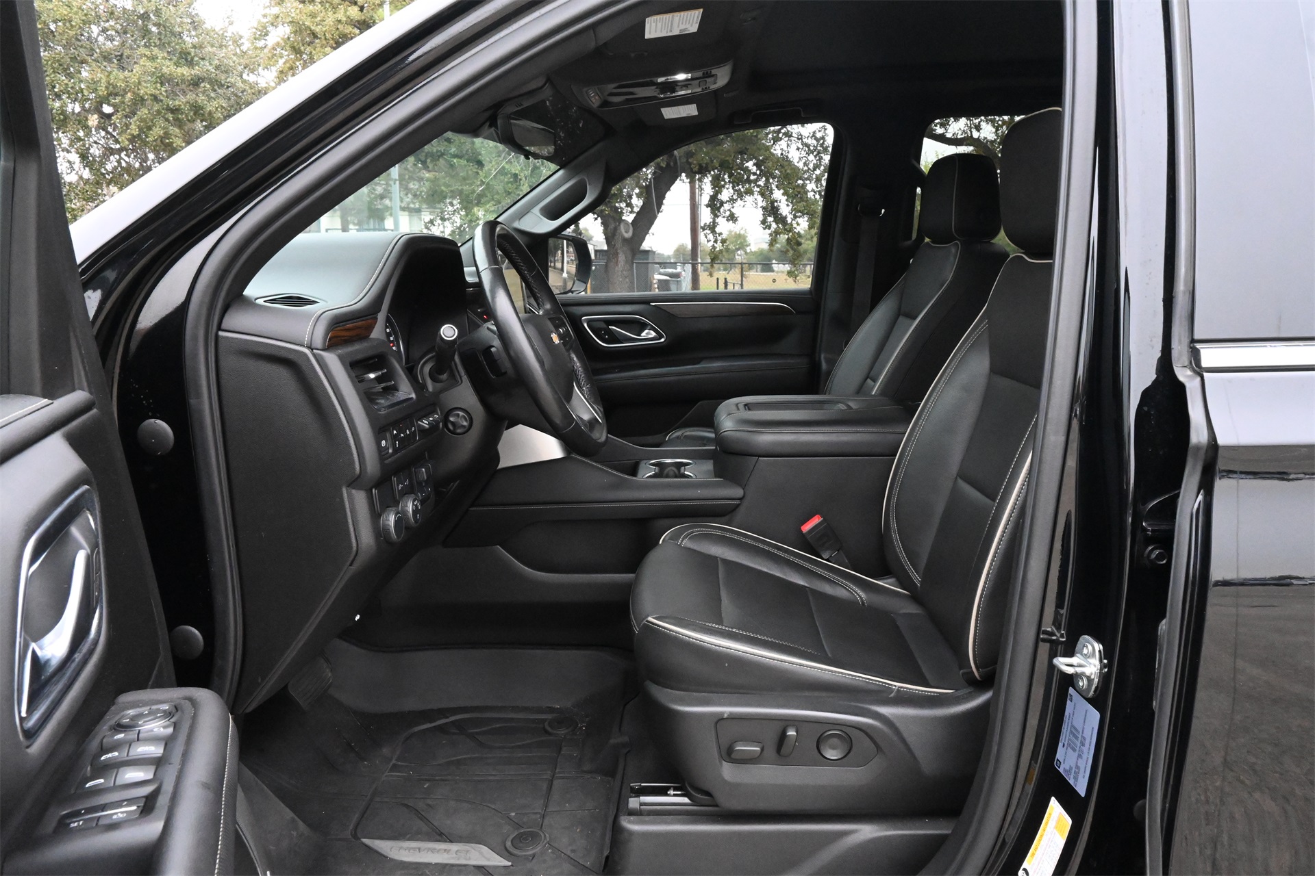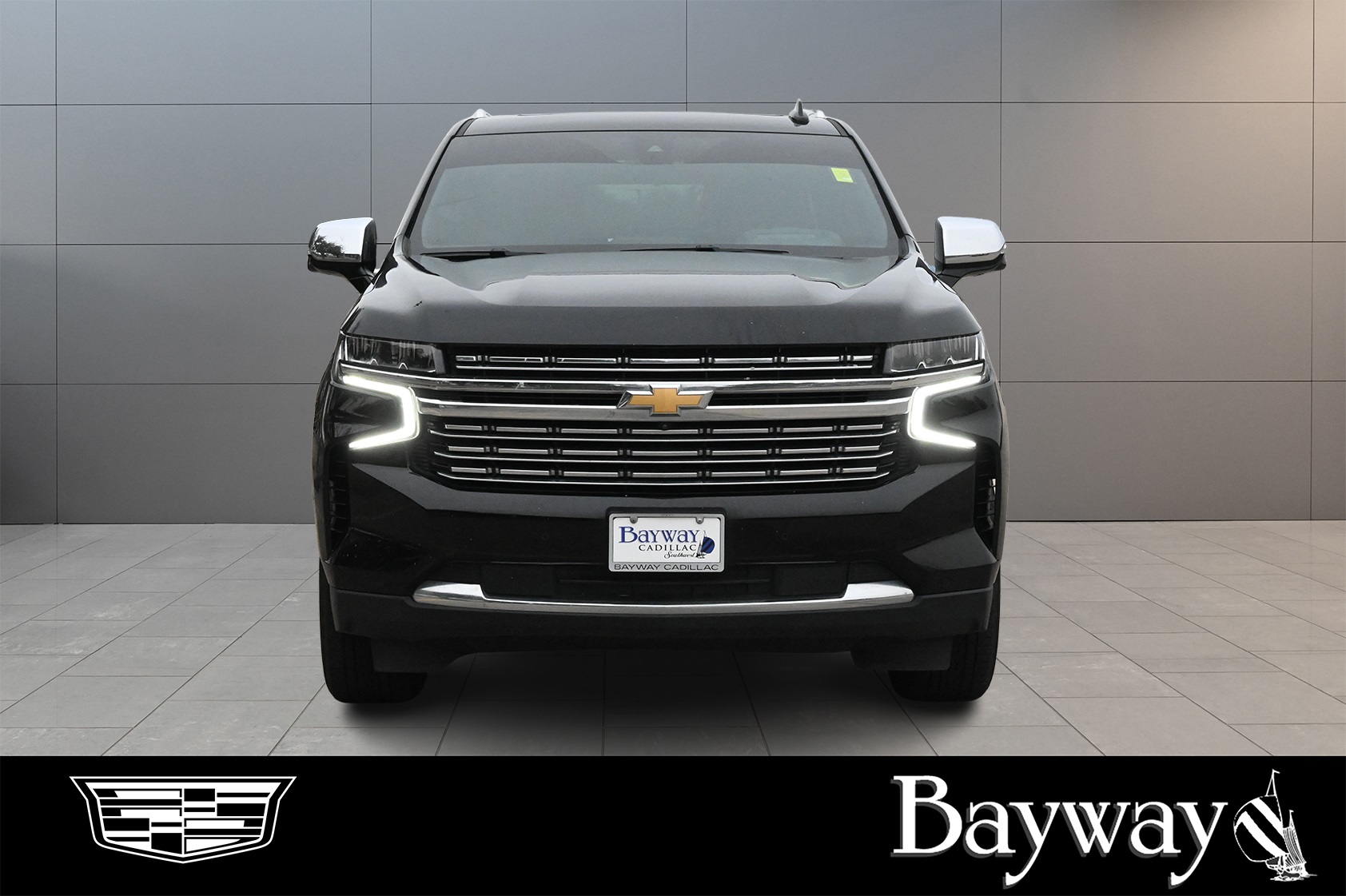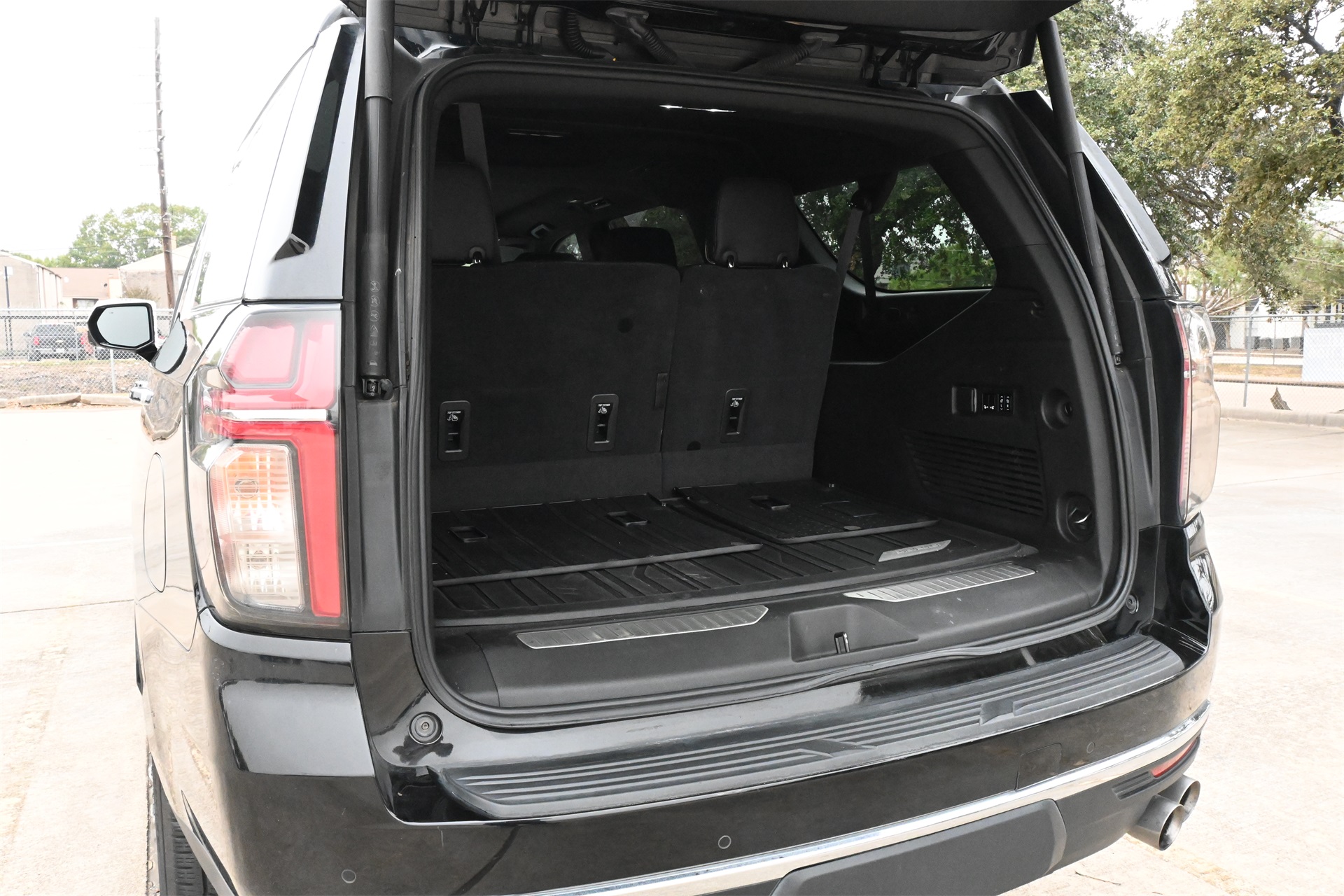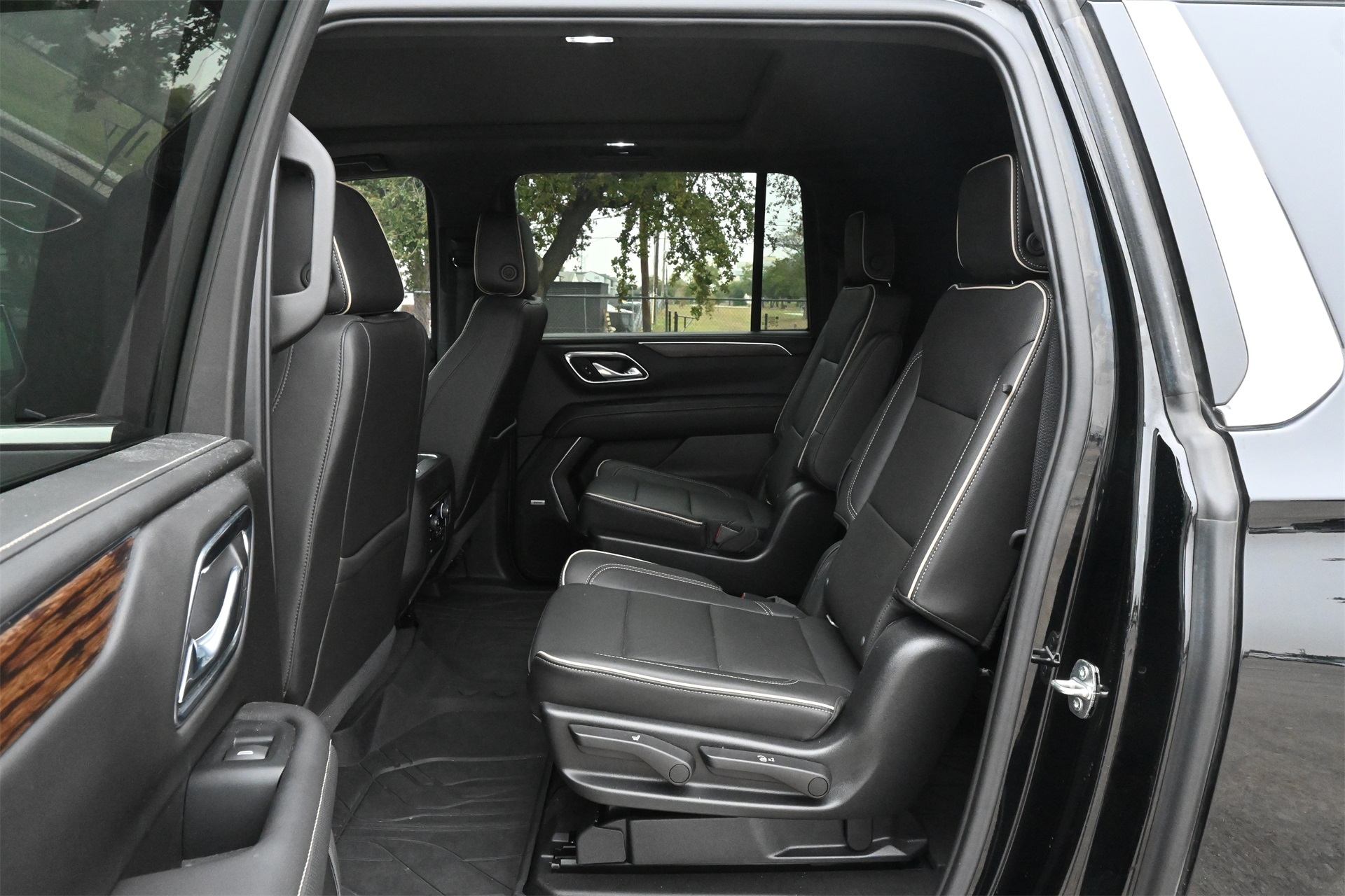 ing Package (Extra Capacity Cooling System), Preferred Equipment Group 1LZ (12-Way Power Driver & Passenger Seat Adjusters, 1st & 2nd Row Color-Keyed Carpeted Floor Mats, 2 USB Data Ports, 3rd Row 60/40 Power-Folding Split-Bench, Auto-Dimming Inside Rear-View Mirror, Automatic Heated Steering Wheel, Bose 10-Speaker Surround w/CenterPoint, Bright Front & Rear Door Sill Plates, Chrome Door Handles w/Body-Color Strip, Chrome Mirror Caps, Color-Keyed Carpeting Floor Covering, Driver & Front Outboard Passenger Airbags, Dual Exhaust System, Enhanced Driver Information Center, Floor Console w/Storage Area, Front & Rear Park Assist, Hands-Free Rear Power Programmable Liftgate, HD Radio, Heated & Ventilated Driver & Front Passenger Seats, Heated 2nd Row Outboard Seats, Heated Driver & Front Passenger Seats, Infotainment Display, Lane Change Alert w/Side Blind Zone Alert, Lane Keep Assist w/Lane Departure Warning, Leather-Wrapped Steering Wheel, LED Daytime Running Lamps, Memory Settings, Outside Heated Power-Adjustable Mirrors, Power Release 2nd Row Bucket Seats, Power Tilt & Telescopic Steering Column, Rear Cross Traffic Alert, Remote Start, Safety Alert Seat, SiriusXM Radio w/360L, and Universal Home Remote), Premium Package (Adaptive Cruise Control, Dual-Pane Power Panoramic Sunroof, and Enhanced Automatic Emergency Braking), 10 Speakers, 20" x 9" Polished Aluminum Wheels, 3.23 Rear Axle Ratio, 3rd row seats: split-bench, 4-Wheel Disc Brakes, ABS brakes, Adaptive suspension, Air Conditioning, Alloy wheels, AM/FM radio: SiriusXM with 360L, Apple CarPlay/Android Auto, Auto High-beam Headlights, Auto-dimming door mirrors, Auto-dimming Rear-View mirror, Auto-leveling suspension, Automatic temperature control, Brake assist, Bumpers: body-color, Compass, Delay-off headlights, Driver door bin, Driver vanity mirror, Dual front impact airbags, Dual front side impact airbags, Electronic Stability Control, Emergency communication system: OnStar and Chevrolet connected services capable, Four wheel independent suspension, Front anti-roll bar, Front Bucket Seats, Front Center Armrest, Front dual zone A/C, Front reading lights, Fully automatic headlights, Garage door transmitter, Heated door mirrors, Heated front seats, Heated rear seats, Heated steering wheel, Illuminated entry, Leather steering wheel, Low tire pressure warning, Magnetic Ride Control Suspension, Memory seat, Navigation System, Occupant sensing airbag, Outside temperature display, Overhead airbag, Overhead console, Panic alarm, Passenger door bin, Passenger vanity mirror, Perforated Leather Seating Surfaces, Power door mirrors, Power driver seat, Power Liftgate, Power passenger seat, Power steering, Power windows, Premium audio system: Chevrolet Infotainment 3 Premium, Radio: Chevrolet Infotainment 3 Premium System, Rain sensing wipers, Rear air conditioning, Rear anti-roll bar, Rear reading lights, Rear window defroster, Rear window wiper, Remote keyless entry, Roof rack: rails only, Security system, Speed control, Speed-sensing steering, Split folding rear seat, Spoiler, Steering wheel memory, Steering wheel mounted audio controls, Tachometer, Telescoping steering wheel, Tilt steering wheel, Traction control, Trip computer, Turn signal indicator mirrors, Variably intermittent wipers, Ventilated front seats, Voltmeter, and Wheel Locks (Set of 4) (LPO) Black RWD 10-Speed Automatic with Overdrive EcoTec3 5.3L V8 CARFAX 1-Owner, Clean CARFAX!, Non-Smoker, Local Trade, Bluetooth, Apple Carpla