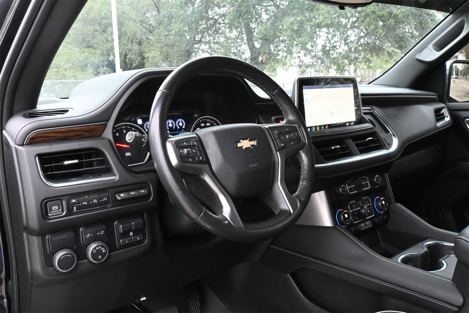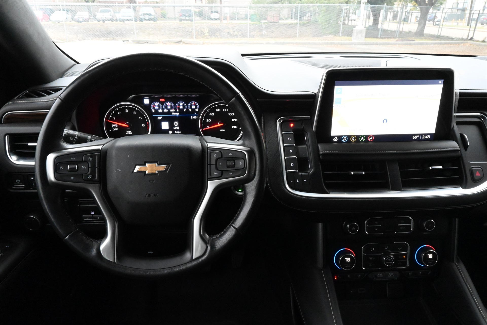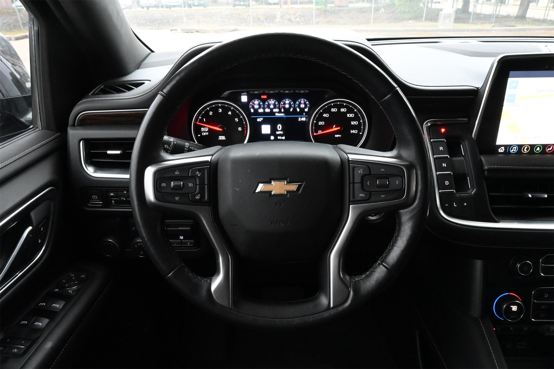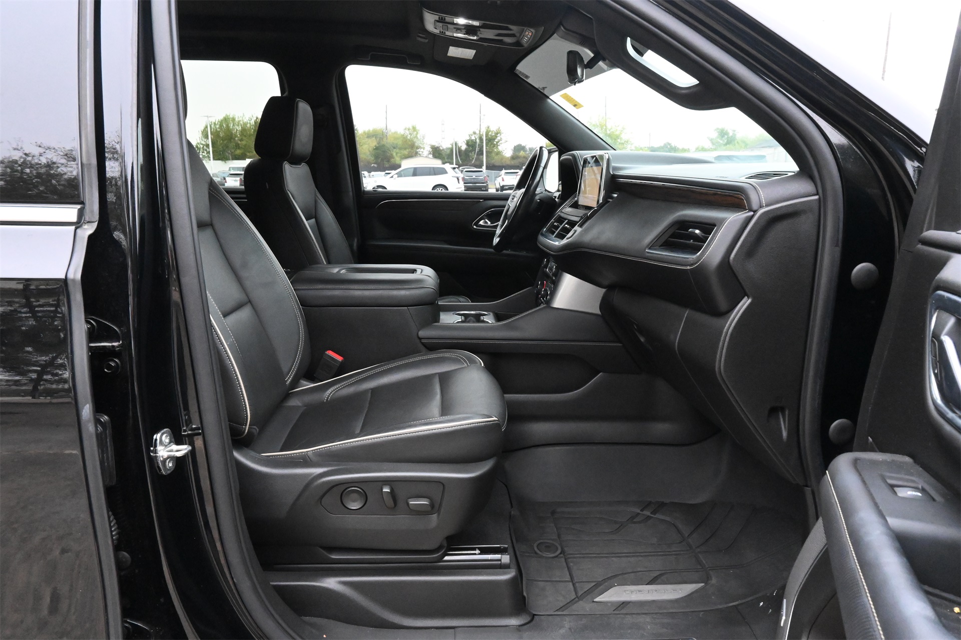 ing Package (Extra Capacity Cooling System), Preferred Equipment Group 1LZ (12-Way Power Driver & Passenger Seat Adjusters, 1st & 2nd Row Color-Keyed Carpeted Floor Mats, 2 USB Data Ports, 3rd Row 60/40 Power-Folding Split-Bench, Auto-Dimming Inside Rear-View Mirror, Automatic Heated Steering Wheel, Bose 10-Speaker Surround w/CenterPoint, Bright Front & Rear Door Sill Plates, Chrome Door Handles w/Body-Color Strip, Chrome Mirror Caps, Color-Keyed Carpeting Floor Covering, Driver & Front Outboard Passenger Airbags, Dual Exhaust System, Enhanced Driver Information Center, Floor Console w/Storage Area, Front & Rear Park Assist, Hands-Free Rear Power Programmable Liftgate, HD Radio, Heated & Ventilated Driver & Front Passenger Seats, Heated 2nd Row Outboard Seats, Heated Driver & Front Passenger Seats, Infotainment Display, Lane Change Alert w/Side Blind Zone Alert, Lane Keep Assist w/Lane Departure Warning, Leather-Wrapped Steering Wheel, LED Daytime Running Lamps, Memory Settings, Outside Heated Power-Adjustable Mirrors, Power Release 2nd Row Bucket Seats, Power Tilt & Telescopic Steering Column, Rear Cross Traffic Alert, Remote Start, Safety Alert Seat, SiriusXM Radio w/360L, and Universal Home Remote), Premium Package (Adaptive Cruise Control, Dual-Pane Power Panoramic Sunroof, and Enhanced Automatic Emergency Braking), 10 Speakers, 20" x 9" Polished Aluminum Wheels, 3.23 Rear Axle Ratio, 3rd row seats: split-bench, 4-Wheel Disc Brakes, ABS brakes, Adaptive suspension, Air Conditioning, Alloy wheels, AM/FM radio: SiriusXM with 360L, Apple CarPlay/Android Auto, Auto High-beam Headlights, Auto-dimming door mirrors, Auto-dimming Rear-View mirror, Auto-leveling suspension, Automatic temperature control, Brake assist, Bumpers: body-color, Compass, Delay-off headlights, Driver door bin, Driver vanity mirror, Dual front impact airbags, Dual front side impact airbags, Electronic Stability Control, Emergency communication system: OnStar and Chevrolet connected services capable, Four wheel independent suspension, Front anti-roll bar, Front Bucket Seats, Front Center Armrest, Front dual zone A/C, Front reading lights, Fully automatic headlights, Garage door transmitter, Heated door mirrors, Heated front seats, Heated rear seats, Heated steering wheel, Illuminated entry, Leather steering wheel, Low tire pressure warning, Magnetic Ride Control Suspension, Memory seat, Navigation System, Occupant sensing airbag, Outside temperature display, Overhead airbag, Overhead console, Panic alarm, Passenger door bin, Passenger vanity mirror, Perforated Leather Seating Surfaces, Power door mirrors, Power driver seat, Power Liftgate, Power passenger seat, Power steering, Power windows, Premium audio system: Chevrolet Infotainment 3 Premium, Radio: Chevrolet Infotainment 3 Premium System, Rain sensing wipers, Rear air conditioning, Rear anti-roll bar, Rear reading lights, Rear window defroster, Rear window wiper, Remote keyless entry, Roof rack: rails only, Security system, Speed control, Speed-sensing steering, Split folding rear seat, Spoiler, Steering wheel memory, Steering wheel mounted audio controls, Tachometer, Telescoping steering wheel, Tilt steering wheel, Traction control, Trip computer, Turn signal indicator mirrors, Variably intermittent wipers, Ventilated front seats, Voltmeter, and Wheel Locks (Set of 4) (LPO) Black RWD 10-Speed Automatic with Overdrive EcoTec3 5.3L V8 CARFAX 1-Owner, Clean CARFAX!, Non-Smoker, Local Trade, Bluetooth, Apple Carpla