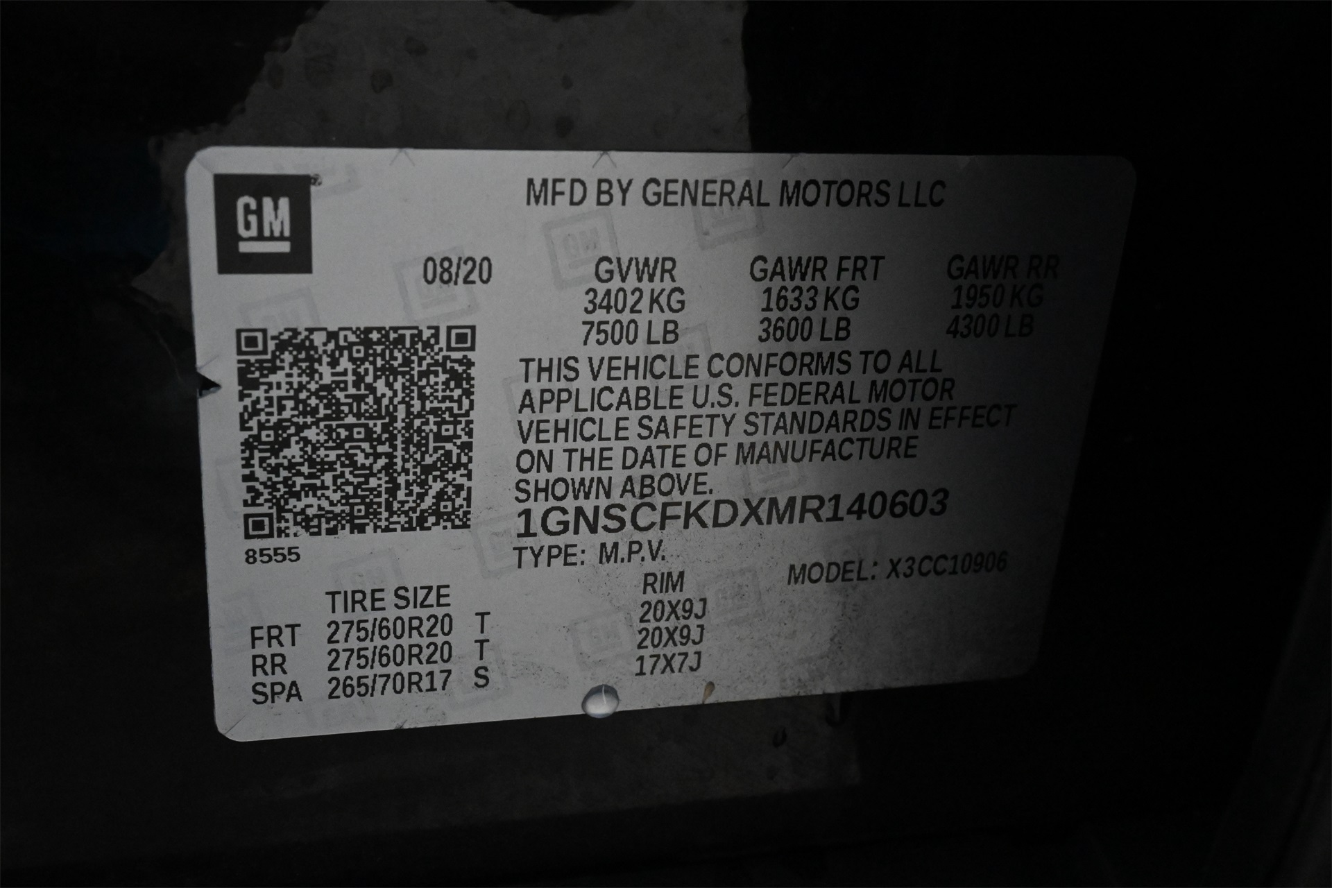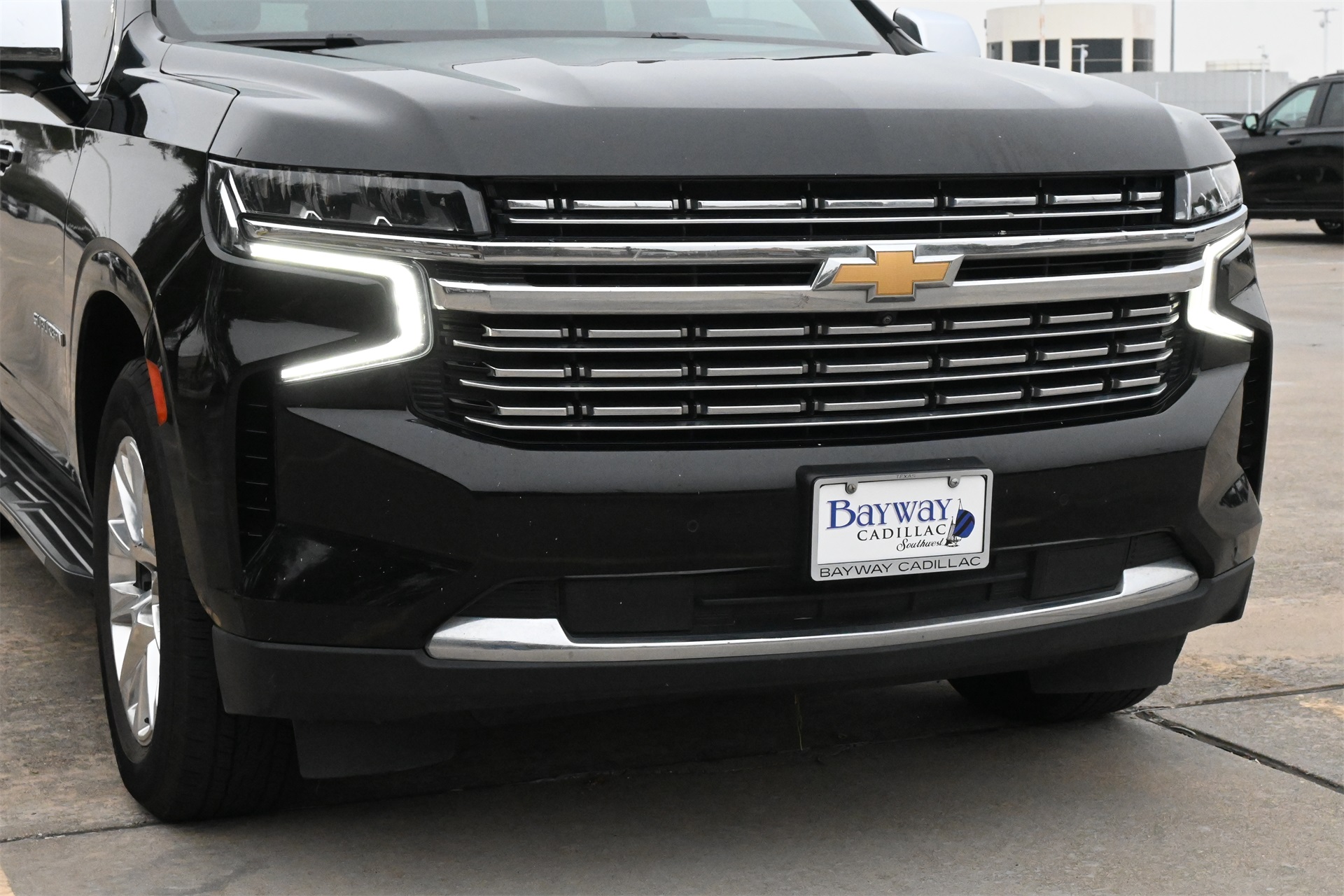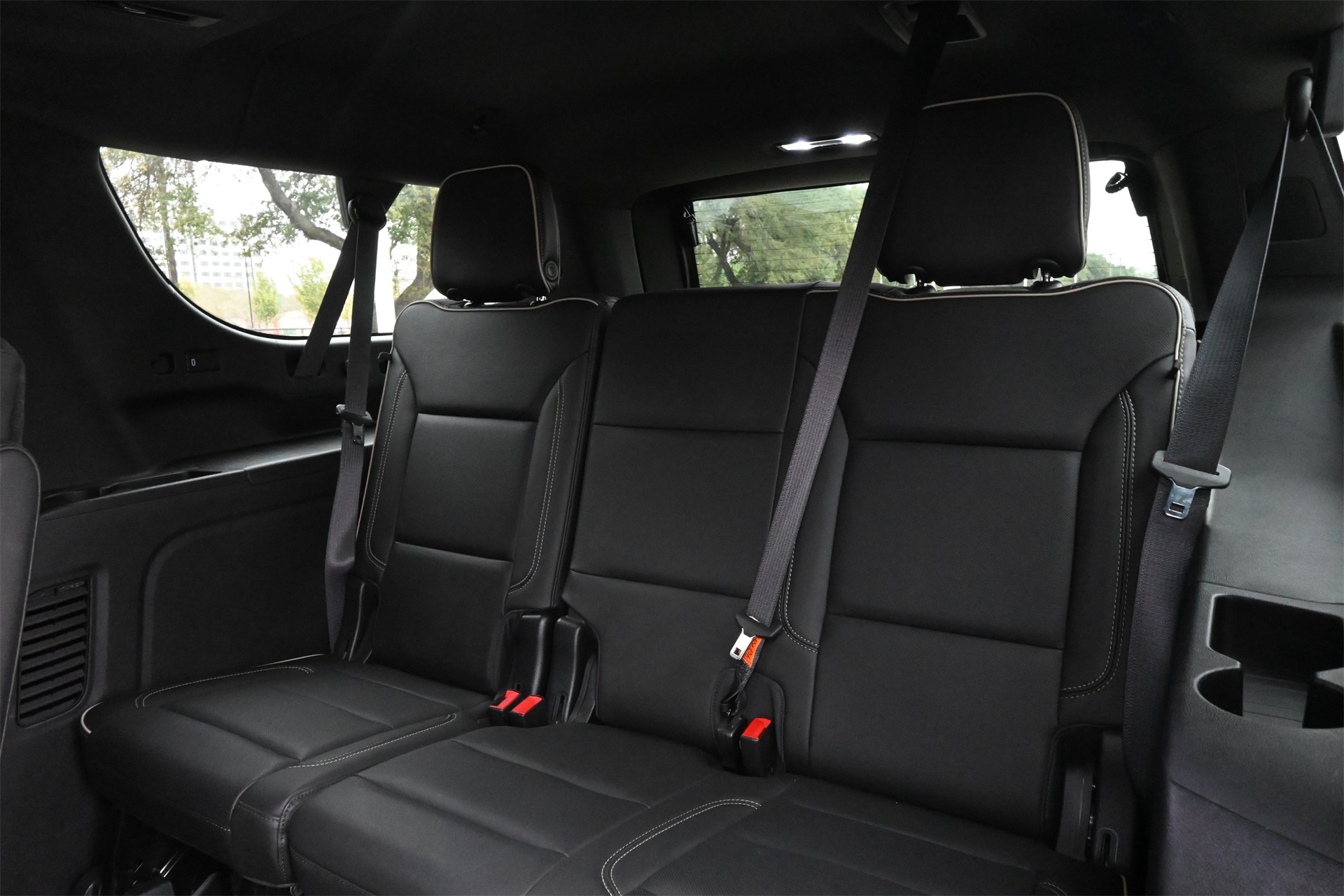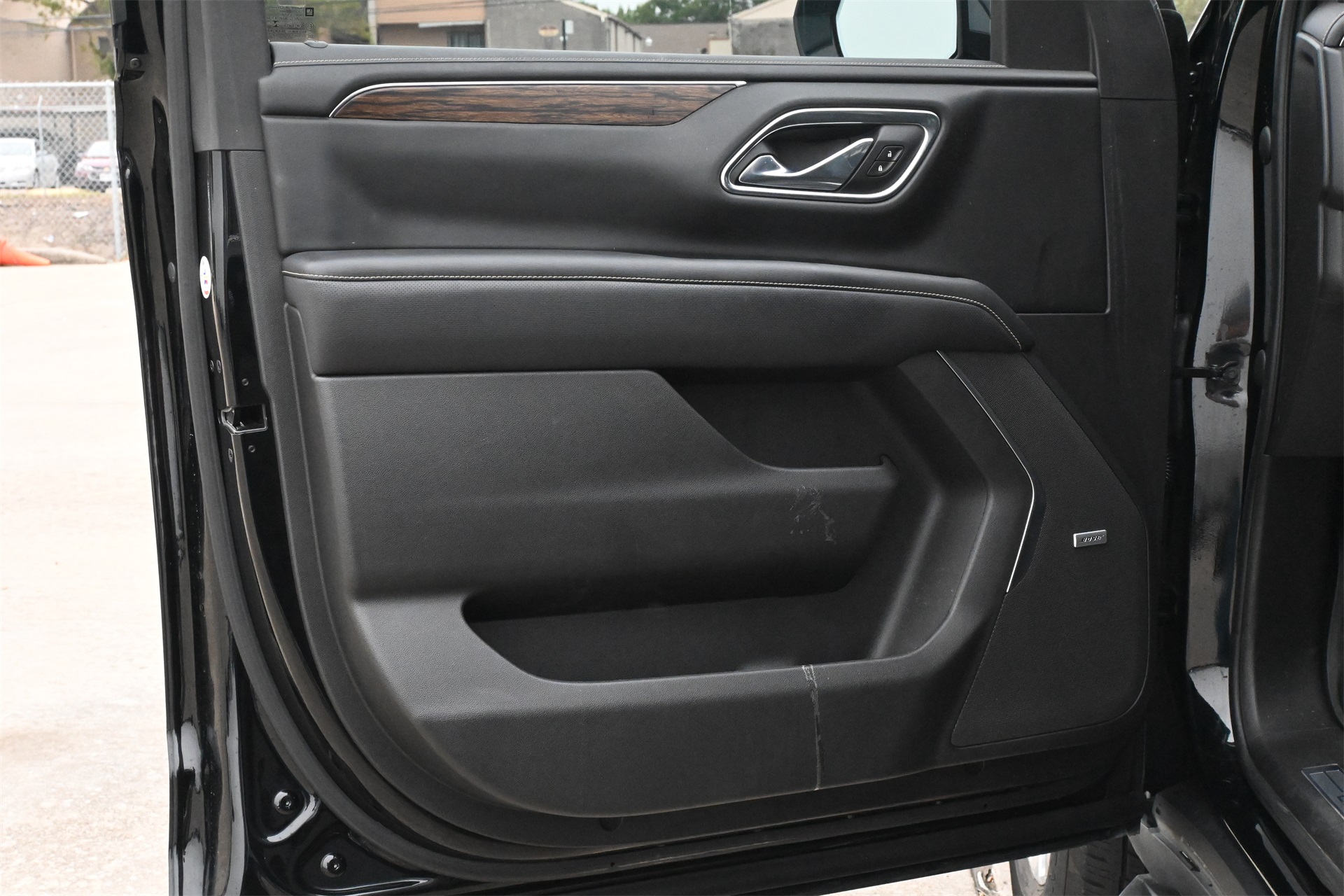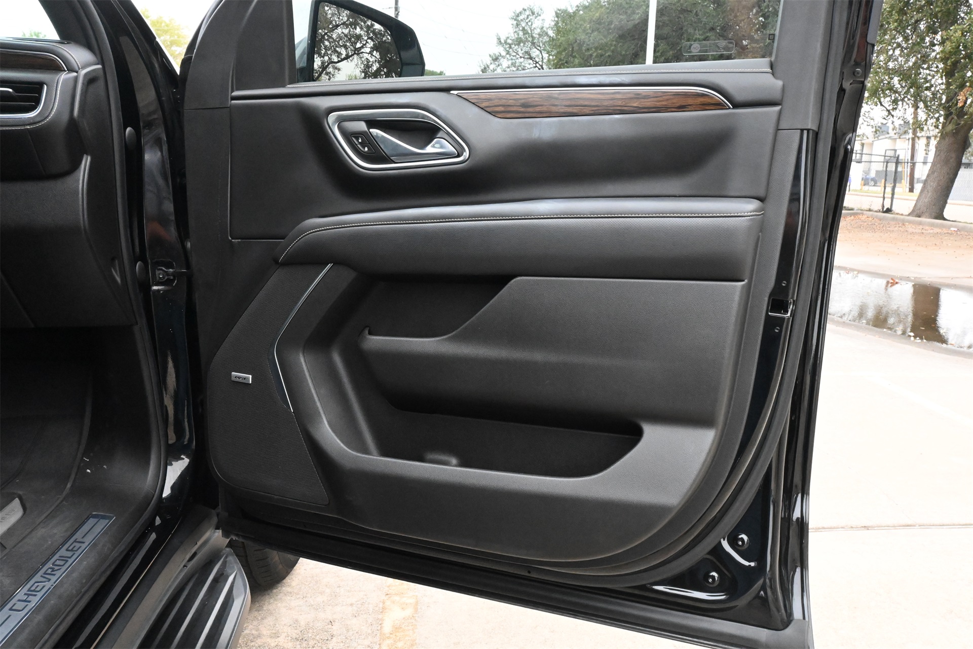 ing Package (Extra Capacity Cooling System), Preferred Equipment Group 1LZ (12-Way Power Driver & Passenger Seat Adjusters, 1st & 2nd Row Color-Keyed Carpeted Floor Mats, 2 USB Data Ports, 3rd Row 60/40 Power-Folding Split-Bench, Auto-Dimming Inside Rear-View Mirror, Automatic Heated Steering Wheel, Bose 10-Speaker Surround w/CenterPoint, Bright Front & Rear Door Sill Plates, Chrome Door Handles w/Body-Color Strip, Chrome Mirror Caps, Color-Keyed Carpeting Floor Covering, Driver & Front Outboard Passenger Airbags, Dual Exhaust System, Enhanced Driver Information Center, Floor Console w/Storage Area, Front & Rear Park Assist, Hands-Free Rear Power Programmable Liftgate, HD Radio, Heated & Ventilated Driver & Front Passenger Seats, Heated 2nd Row Outboard Seats, Heated Driver & Front Passenger Seats, Infotainment Display, Lane Change Alert w/Side Blind Zone Alert, Lane Keep Assist w/Lane Departure Warning, Leather-Wrapped Steering Wheel, LED Daytime Running Lamps, Memory Settings, Outside Heated Power-Adjustable Mirrors, Power Release 2nd Row Bucket Seats, Power Tilt & Telescopic Steering Column, Rear Cross Traffic Alert, Remote Start, Safety Alert Seat, SiriusXM Radio w/360L, and Universal Home Remote), Premium Package (Adaptive Cruise Control, Dual-Pane Power Panoramic Sunroof, and Enhanced Automatic Emergency Braking), 10 Speakers, 20" x 9" Polished Aluminum Wheels, 3.23 Rear Axle Ratio, 3rd row seats: split-bench, 4-Wheel Disc Brakes, ABS brakes, Adaptive suspension, Air Conditioning, Alloy wheels, AM/FM radio: SiriusXM with 360L, Apple CarPlay/Android Auto, Auto High-beam Headlights, Auto-dimming door mirrors, Auto-dimming Rear-View mirror, Auto-leveling suspension, Automatic temperature control, Brake assist, Bumpers: body-color, Compass, Delay-off headlights, Driver door bin, Driver vanity mirror, Dual front impact airbags, Dual front side impact airbags, Electronic Stability Control, Emergency communication system: OnStar and Chevrolet connected services capable, Four wheel independent suspension, Front anti-roll bar, Front Bucket Seats, Front Center Armrest, Front dual zone A/C, Front reading lights, Fully automatic headlights, Garage door transmitter, Heated door mirrors, Heated front seats, Heated rear seats, Heated steering wheel, Illuminated entry, Leather steering wheel, Low tire pressure warning, Magnetic Ride Control Suspension, Memory seat, Navigation System, Occupant sensing airbag, Outside temperature display, Overhead airbag, Overhead console, Panic alarm, Passenger door bin, Passenger vanity mirror, Perforated Leather Seating Surfaces, Power door mirrors, Power driver seat, Power Liftgate, Power passenger seat, Power steering, Power windows, Premium audio system: Chevrolet Infotainment 3 Premium, Radio: Chevrolet Infotainment 3 Premium System, Rain sensing wipers, Rear air conditioning, Rear anti-roll bar, Rear reading lights, Rear window defroster, Rear window wiper, Remote keyless entry, Roof rack: rails only, Security system, Speed control, Speed-sensing steering, Split folding rear seat, Spoiler, Steering wheel memory, Steering wheel mounted audio controls, Tachometer, Telescoping steering wheel, Tilt steering wheel, Traction control, Trip computer, Turn signal indicator mirrors, Variably intermittent wipers, Ventilated front seats, Voltmeter, and Wheel Locks (Set of 4) (LPO) Black RWD 10-Speed Automatic with Overdrive EcoTec3 5.3L V8 CARFAX 1-Owner, Clean CARFAX!, Non-Smoker, Local Trade, Bluetooth, Apple Carpla
