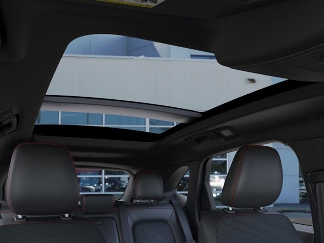 r, Compass, Delay-off headlights, Driver door bin, Driver vanity mirror, Dual front impact airbags, Dual front side impact airbags, Easy Access Cargo Shade, Electronic Stability Control, Emergency communication system: SYNC 4 911 Assist, FordPass Connect, Four wheel independent suspension, Front anti-roll bar, Front Bucket Seats, Front Center Armrest, Front dual zone A/C, Front fog lights, Front License Plate Bracket, Front reading lights, Fully automatic headlights, Heated door mirrors, Heated front seats, Heated steering wheel, Heated Vinyl/Cloth Front Sport Contour Bucket Seats, Illuminated entry, Knee airbag, Low tire pressure warning, Memory seat, Navigation system: Connected Navigation, Occupant sensing airbag, Outside temperature display, Overhead airbag, Overhead console, Panic alarm, Panoramic Vista Roof, Passenger door bin, Passenger vanity mirror, Power door mirrors, Power driver seat, Power Liftgate, Power passenger seat, Power steering, Power windows, Radio data system, Rear anti-roll bar, Rear reading lights, Rear seat center armrest, Rear window defroster, Rear window wiper, Remote keyless entry, Security system, Speed control, Speed-sensing steering, Speed-Sensitive Wipers, Split folding rear seat, Spoiler, Sport steering wheel, Steering wheel mounted audio controls, SYNC 4 w/Enhanced Voice Recognition, Tachometer, Telescoping steering wheel, Tilt steering wheel, Traction control, Trip computer, Variably intermittent wipers, and Wheels: 19" Machined-Face Ebony-Painted Aluminum. 42/36 City/Highway MPG