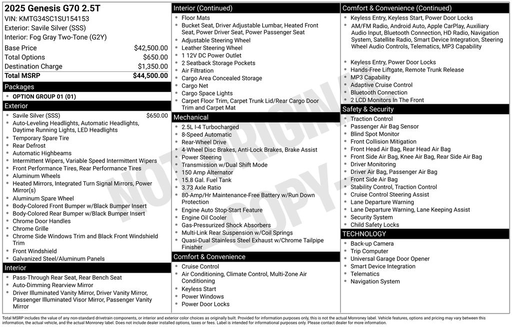 Savile Silver 2025 Genesis G70 2.5T RWD 8-Speed Automatic I4 1 OWNER, Alloy wheels, Leatherette Seating Surfaces, Navigation System, Option Group 01, Power passenger seat, Wheels: 19" x 8.0J Fr & 19" x 8.5J Rr Alloy.