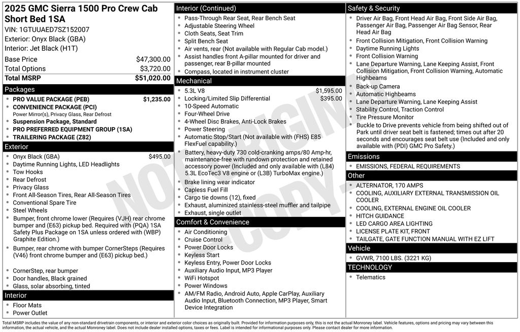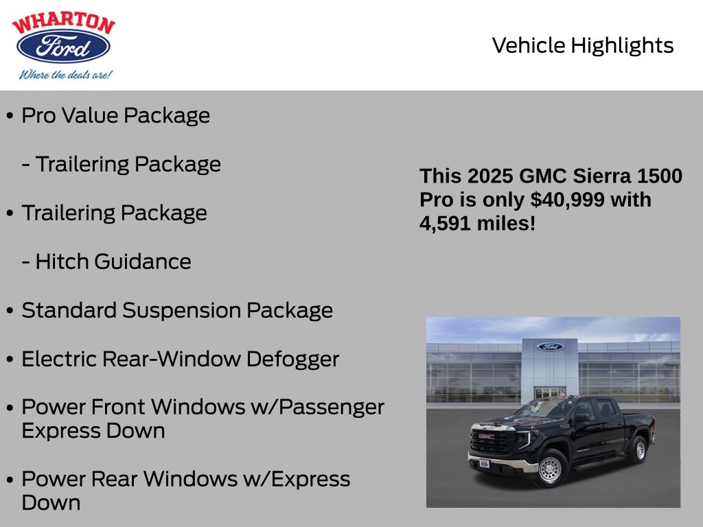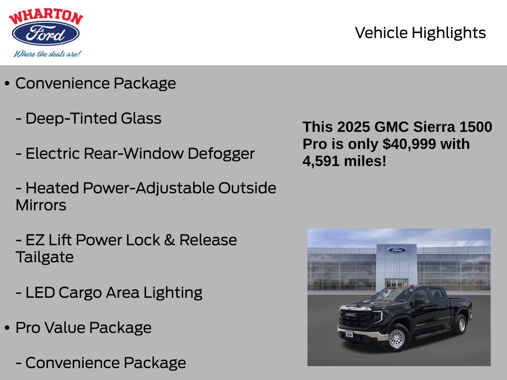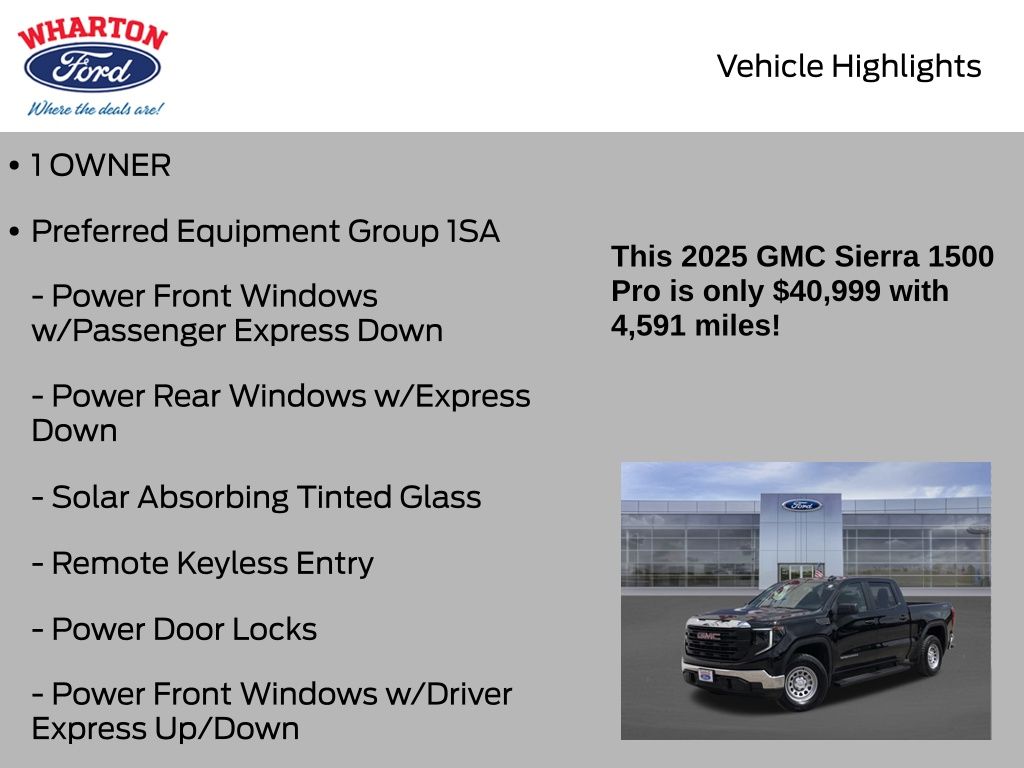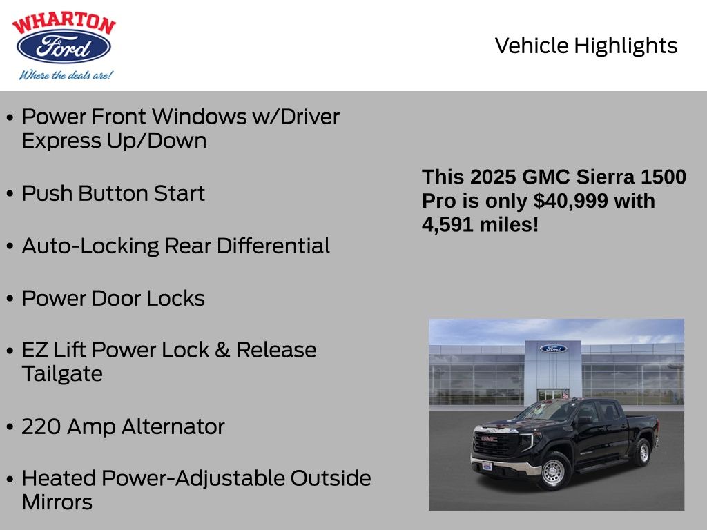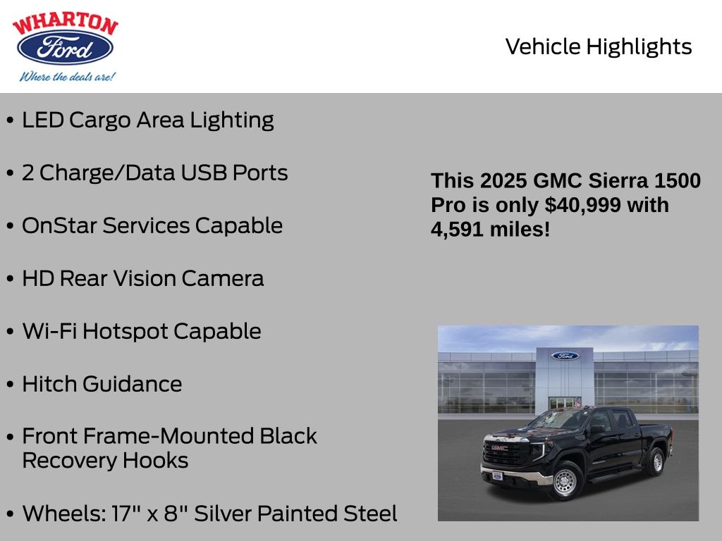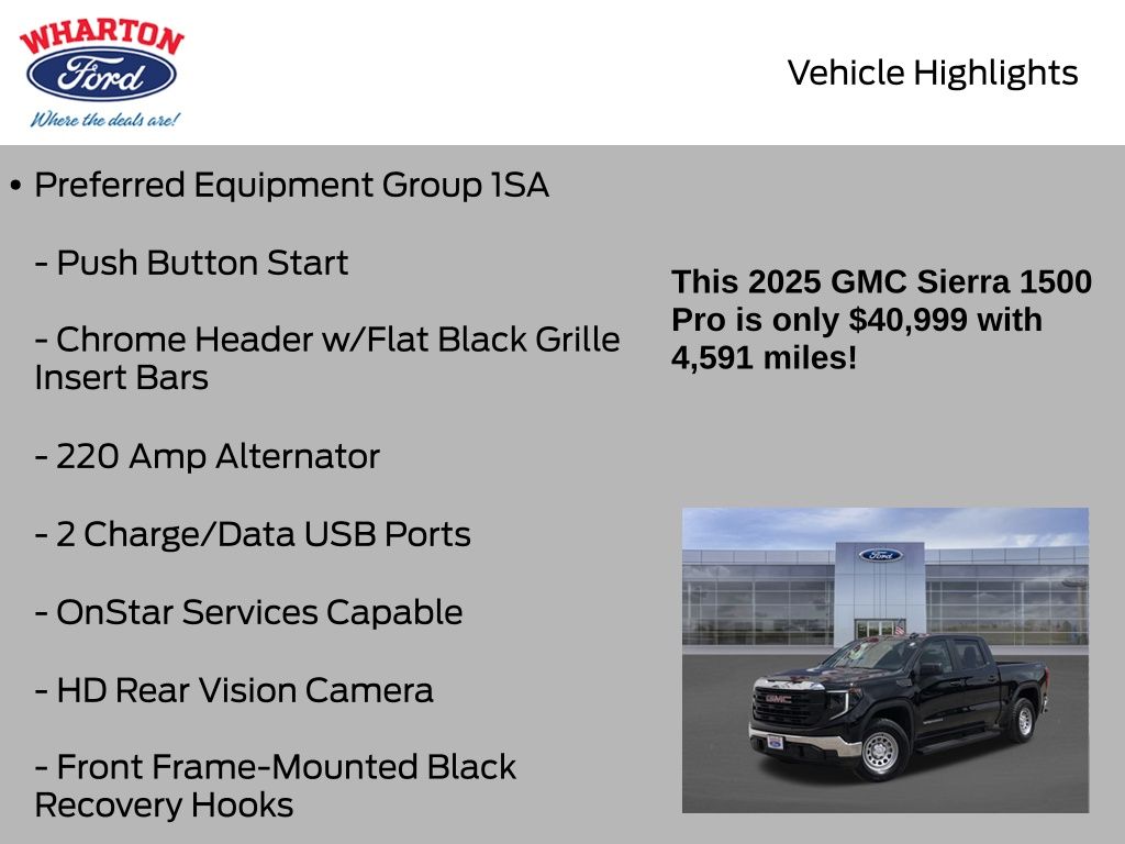 Onyx Black 2025 GMC Sierra 1500 Pro 4WD 10-Speed Automatic EcoTec3 5.3L V8 1 OWNER, 10-Speed Automatic, 4WD, Jet Black w/Cloth Seat Trim, 2 Charge/Data USB Ports, 220 Amp Alternator, Auto-Locking Rear Differential, Chrome Header w/Flat Black Grille Insert Bars, Convenience Package, Deep-Tinted Glass, Electric Rear-Window Defogger, EZ Lift Power Lock & Release Tailgate, Front Frame-Mounted Black Recovery Hooks, HD Rear Vision Camera, Heated Power-Adjustable Outside Mirrors, Hitch Guidance, LED Ca